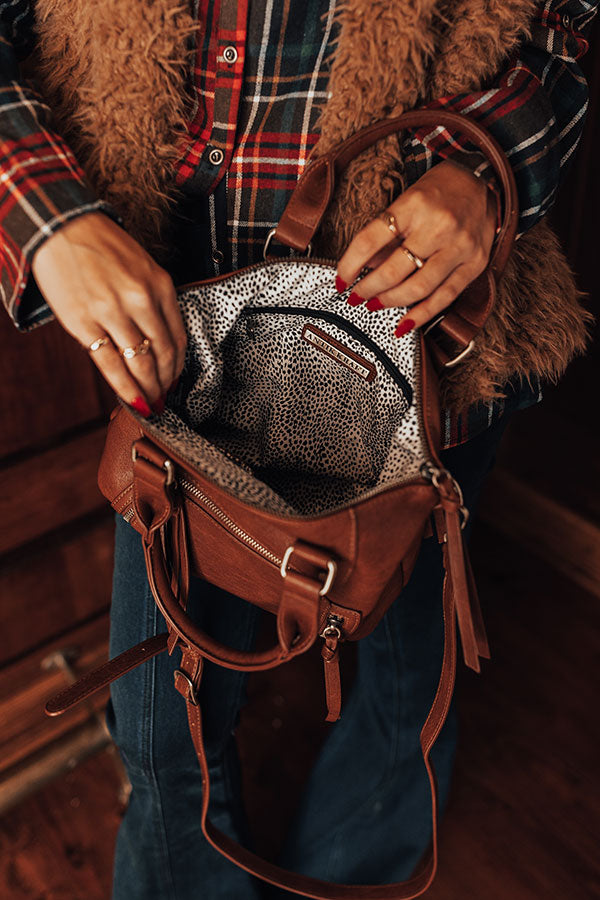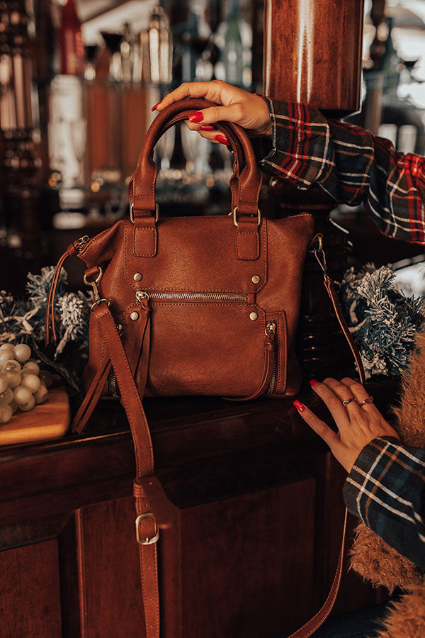 You won't find a more practical fall bag than our mpale colored 'Thankful Thoughts' crossbody featuring faux leather material, two handles, a removable and adjustable shoulder strap, a zip closure pocket on the front with two zipper accents and a an extra zip closure pocket on the back, and a spacious fully lined zip closure pouch with an additional zip closure pocket on the inside!