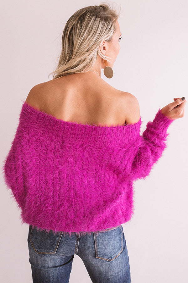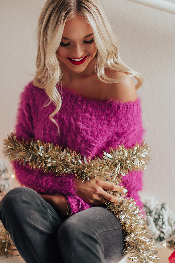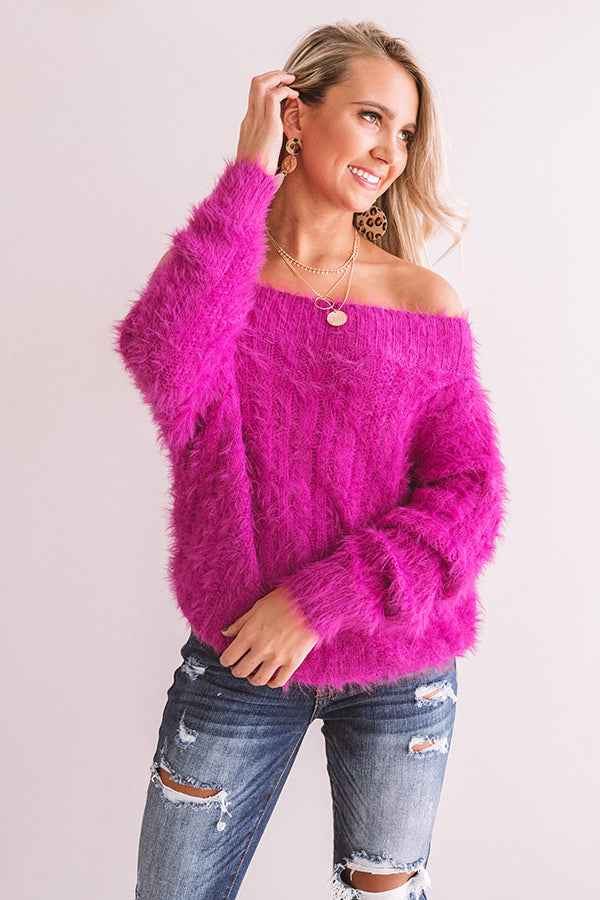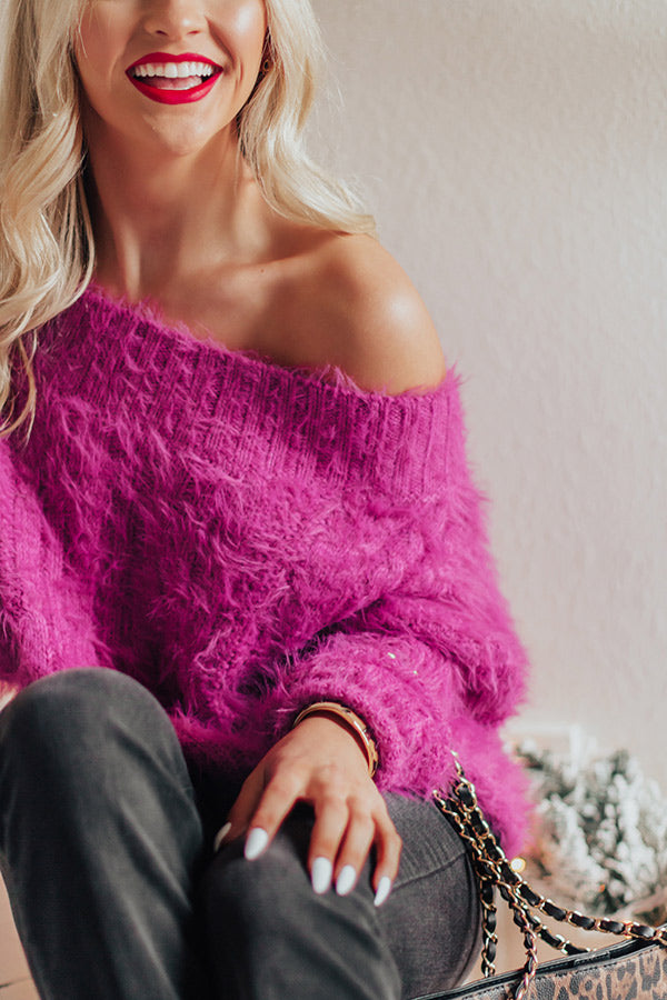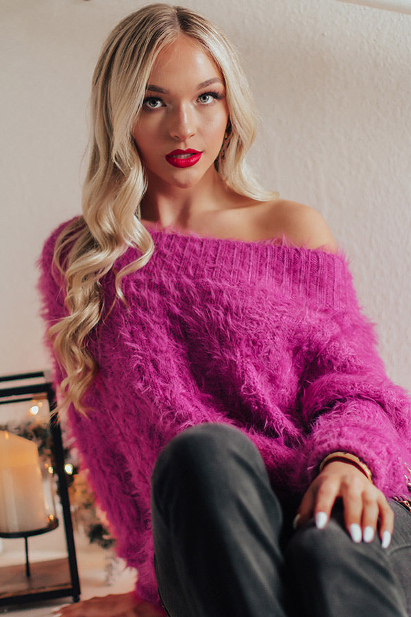 You will look like you are living "that posh life" when you wear this charming purple hued sweater featuring soft lightweight tight material with ribbed detailing and ultra fuzzy texturing, an off the shoulder fit with a straight neckline, long loose sleeves with fitted cuffs, and a relaxed silhouette that falls into a straight hemline! We have styled this vibrant cold weather piece with some black flares and neutral booties, but you can also wear it with some distressed light wash ankle skinnies, "The Mia Faux Suede Lace Up Heel in Hot Pink," and our "Own The Spotlight Leopard Hat!" Measurements