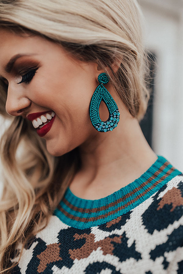 You are sure to turn heads when you accessorize with our teal colored "That's Amore" beaded statement earrings featuring circle studs and large open teardrops adorned with matching faux diamonds!