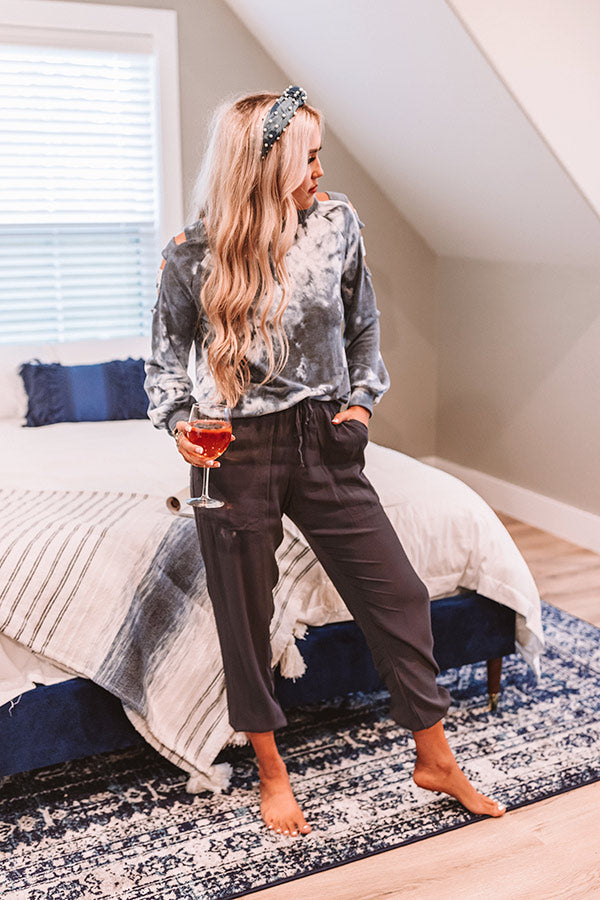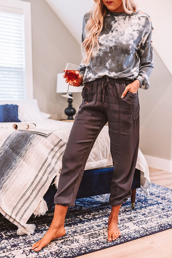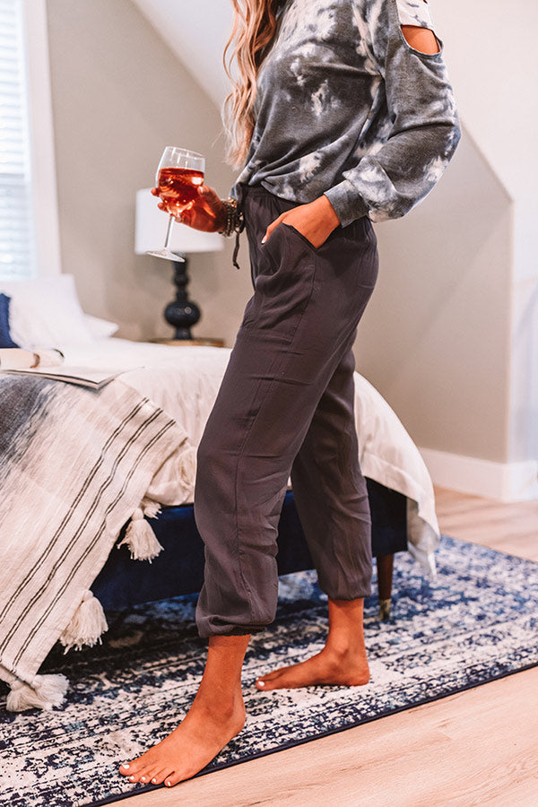 Lounge in luxury with our charcoal colored "Abella" joggers featuring ultra lightweight material, a wide smocked waistline with a tie belt closure, accent side pockets and a single back pocket, and a relaxed pants silhouette that falls into fitted ankle length hemlines! You can style these cuties up with a tie dye top and a matching headband, or you can dress them down with a basic white tee under a cropped jean jacket, "The Linden Camo Sneaker," sunnies, and "The Essential Faux Leather Backpack in Black!" Measurements