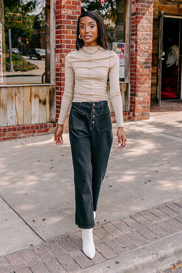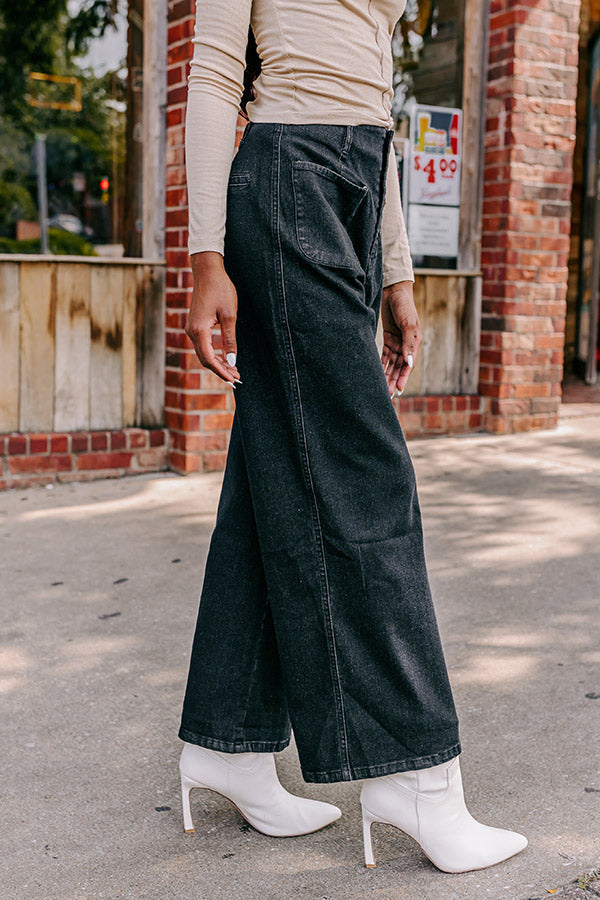 - We love a unique denim option like these trendy jeans! - Unlined semi-stretch denim material - A high waistline with belt loops and four button closure - Two functional front pockets - Two faux pocket cut accents on the back - A relaxed yet flattering silhouette that ends in wide ankle length hemlines