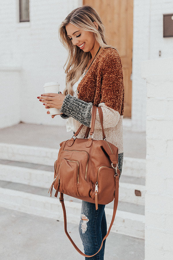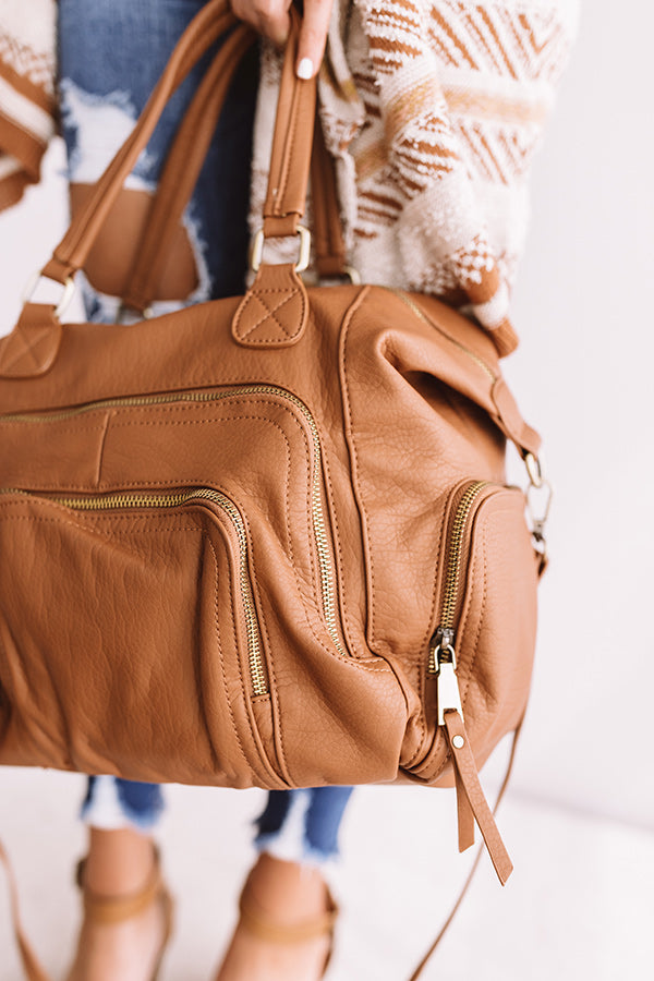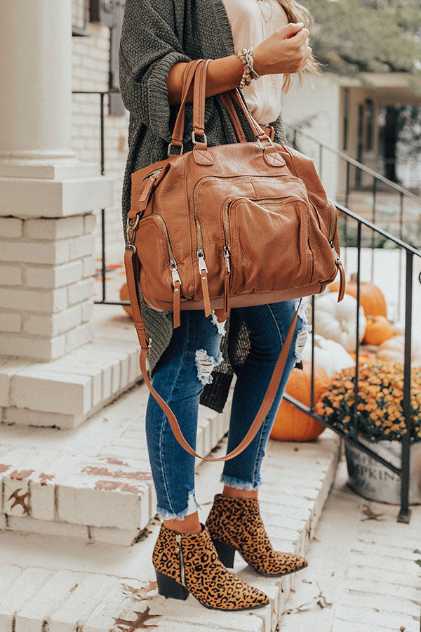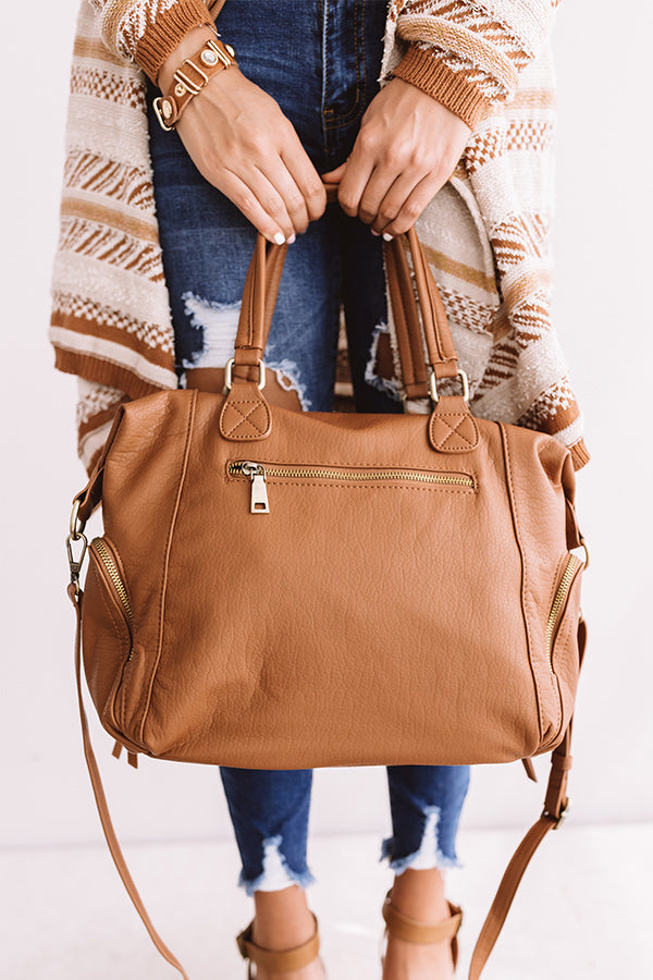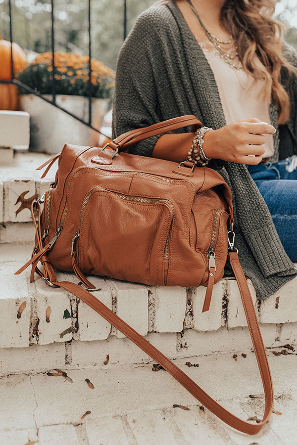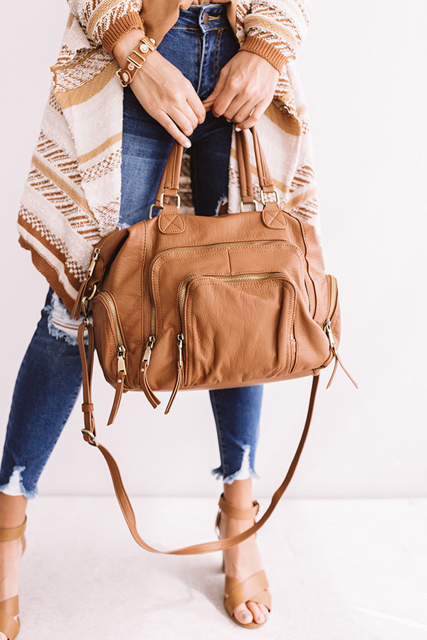 You will have the ultimate adventure when carrying this cinnamon colored tote featuring relaxed faux leather material, two tote handles, an adjustable and removable shoulder strap, five exterior pockets, silver accents, and a spacious fully lined interior pouch with a zip closure!