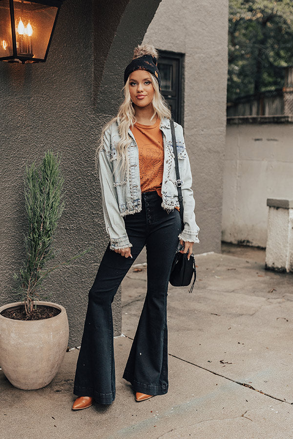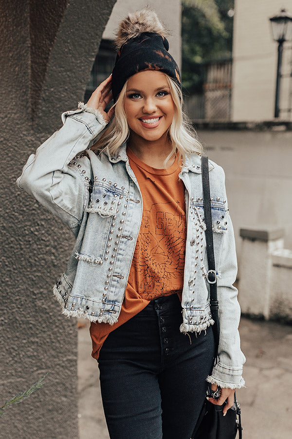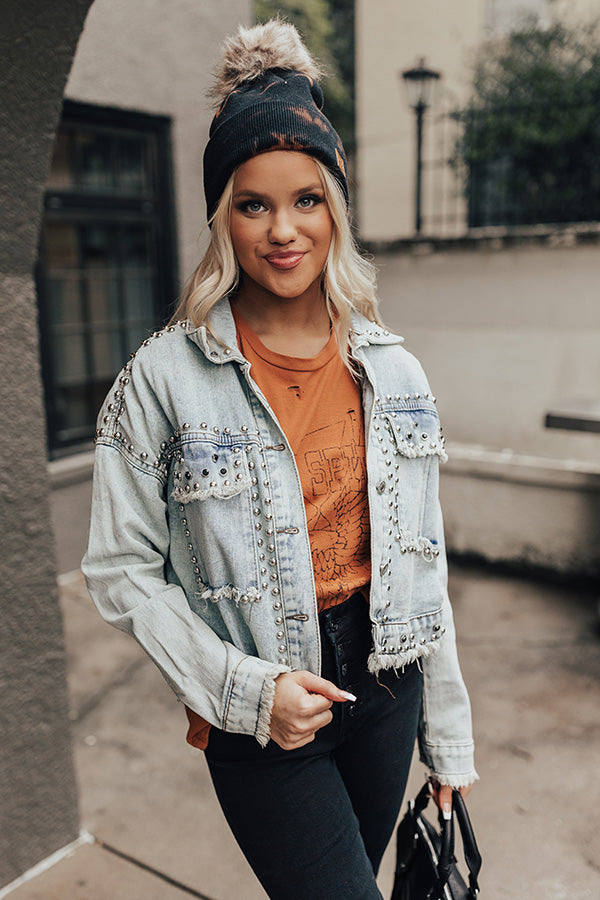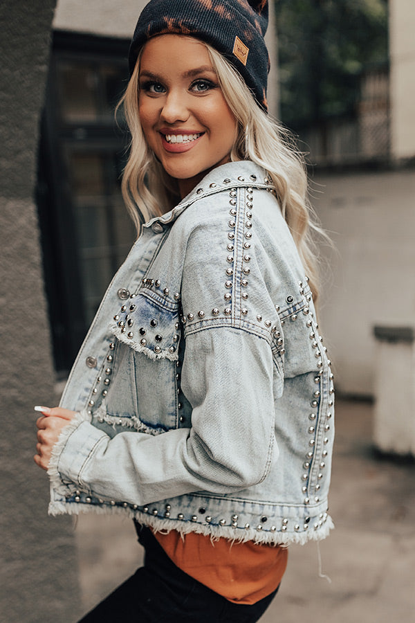 Add a bit of glam to your chic grunge look with our upscale 'Aleana' jacket featuring light wash material with silver stud and black rhinestone detailing, frayed edges along the trim, long loose sleeves with button closure cuffs, two accent chest pockets, a button down front with a collared neckline, and a relaxed silhouette that ends in a straight hemline! Measurements