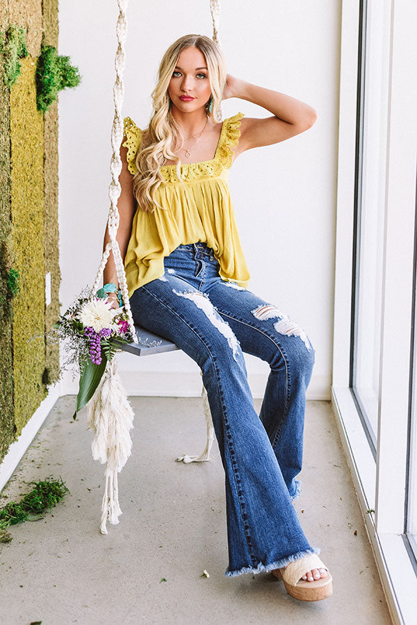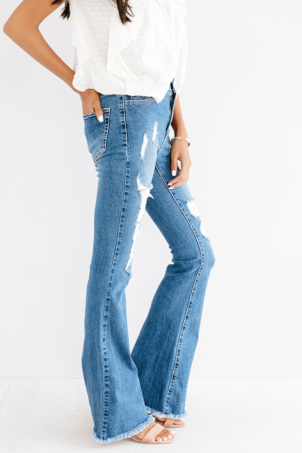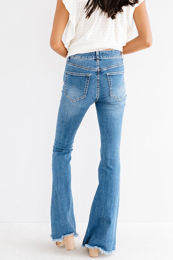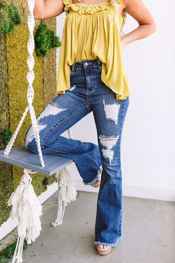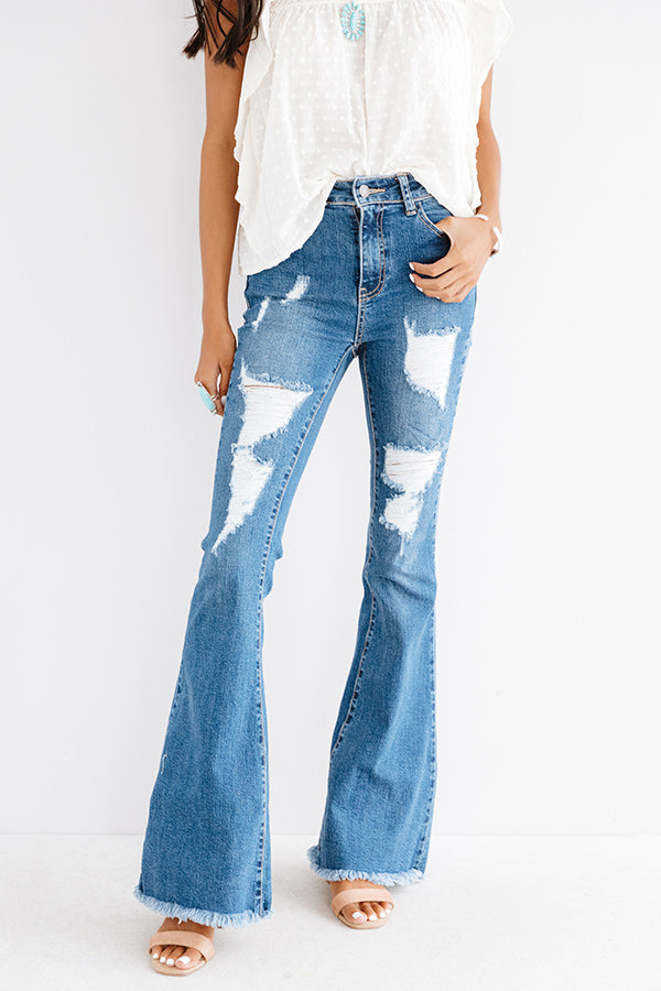 Stay groovy this summer with "The Alira" flares featuring lightweights stretchy material, a high elastic waistline, a dark wash color, ultra distressed detailing, and a form fitting silhouette that falls into oversized raw cut floor-length hemlines! These retro bottoms will take your from season to season when you wear with your favorite open toed heel, trendy sunnies, and tank top in the summer and with booties, a chic tote, and a sweater in the fall! This item does not include pocket cuts.