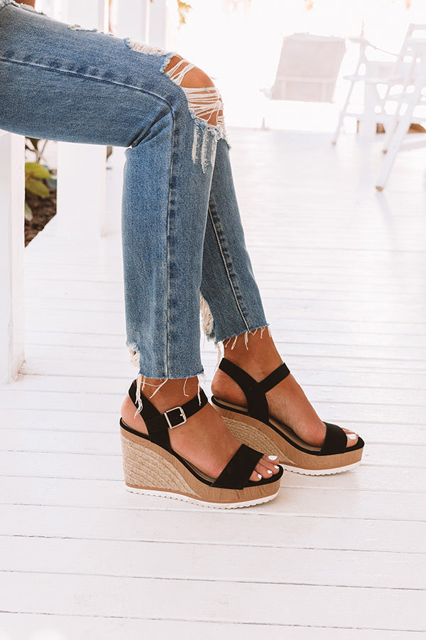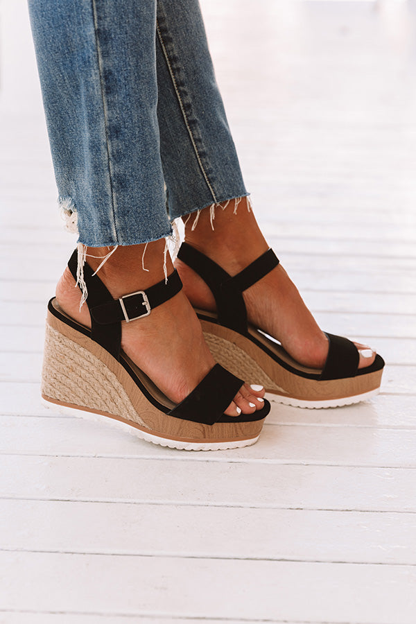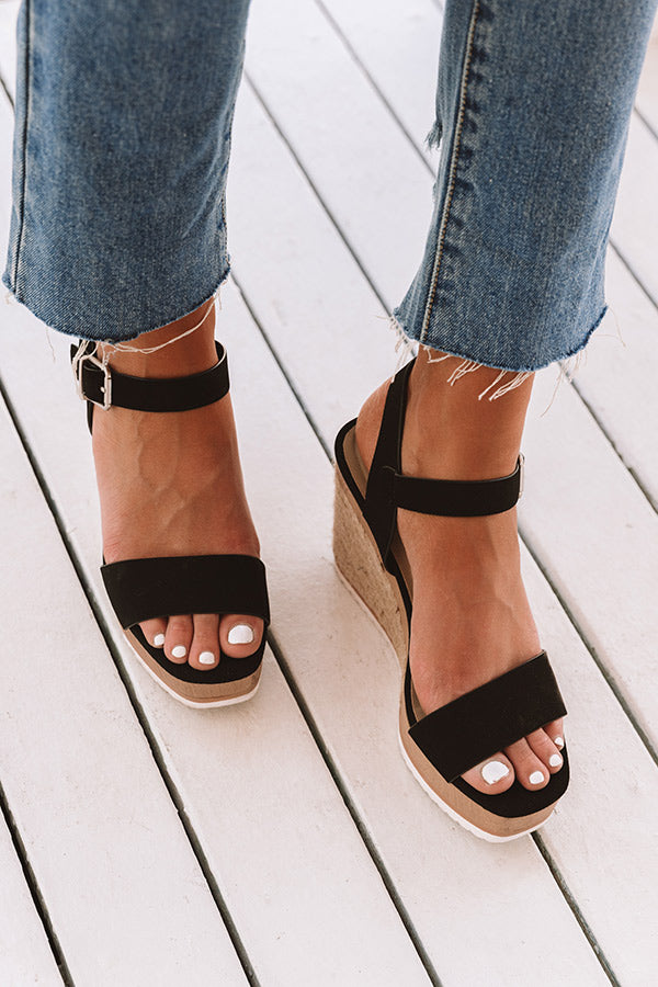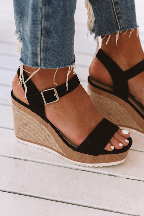 Welcome the warmer summer months in style with the adorable black 'Allen Wedge' featuring 4.5-inch heels with braided texturing, a wide over-the-foot strap with square open toes, and a buckled ankle strap with an open heel silhouette! This wedge runs more true to size.