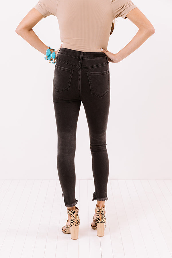 Life is more than just fitting into your jeans, but we believe you will LOVE the look and feel of our chic black 'Allyana' skinnies featuring lightweight denim material with distressed knee detailing, a high waistline with belt loops, a classic five pocket cut, a hidden zip fly with a button closure, and a form fitting silhouette that falls into frayed ankle-length hemlines!