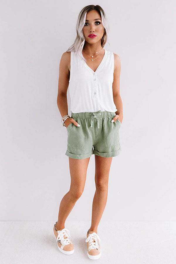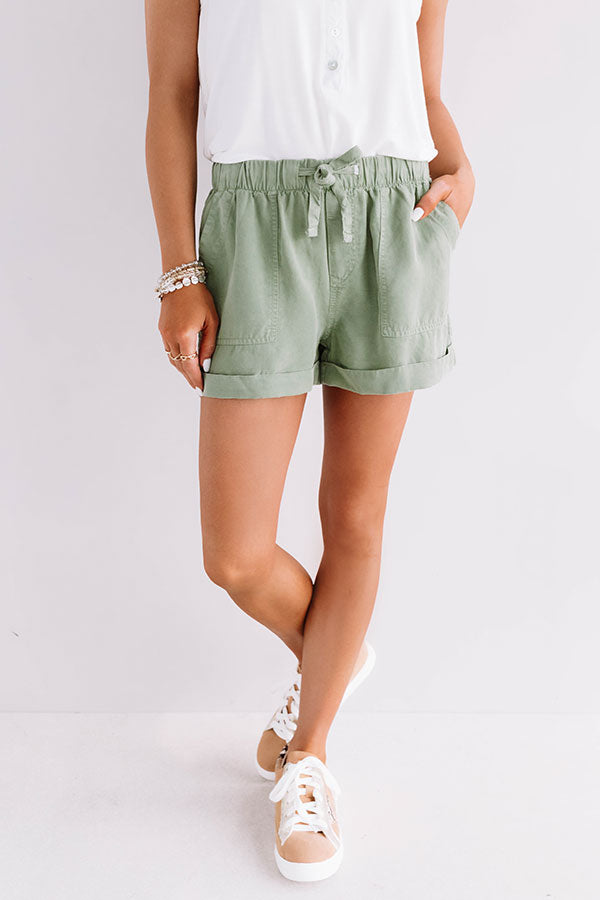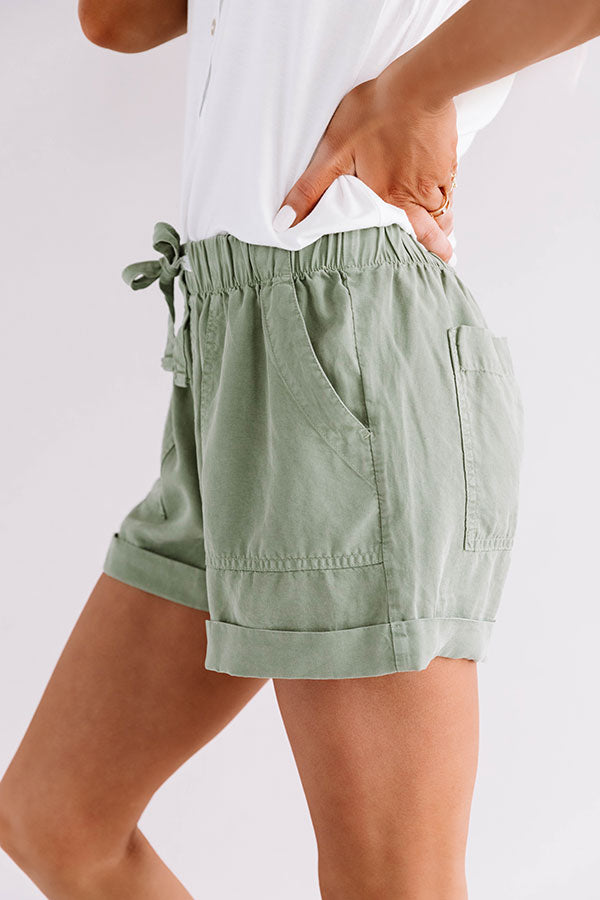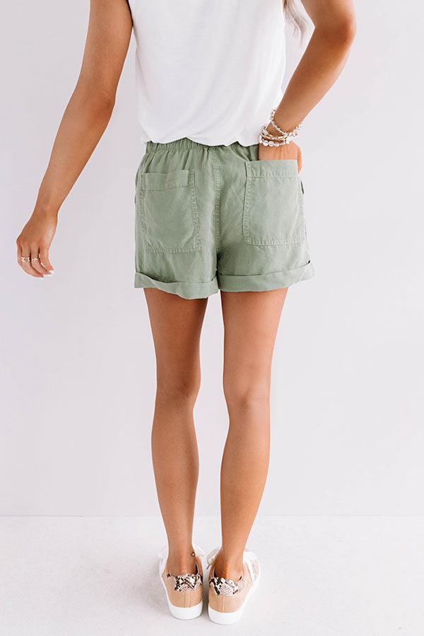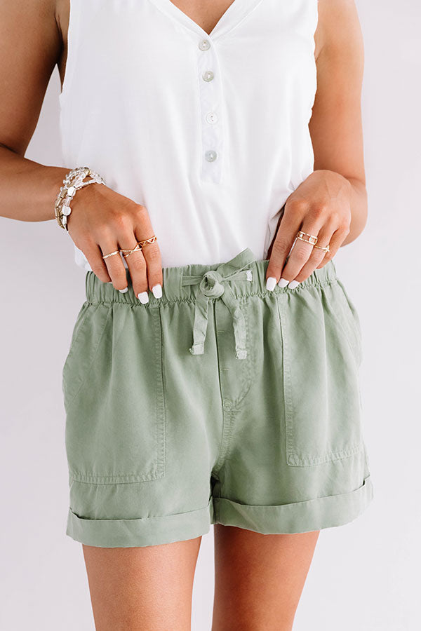 Strut in style with these adorable sage colored "Amalee" shorts featuring soft lightweight chambray material, a wide smocked waistline with a tie belt, accent side and back pockets, and a relaxed silhouette that falls into straight cuffed upper-thigh length hemlines! You can wear these summer cuties a variety of ways, like with a basic white tank and trendy sneakers, or you can toss on a denim jean jacket and add our white "Five Star Snake Print Wedge," sunnies, and our "Times Square Kisses Snake Print Tote in Grey!" Measurements