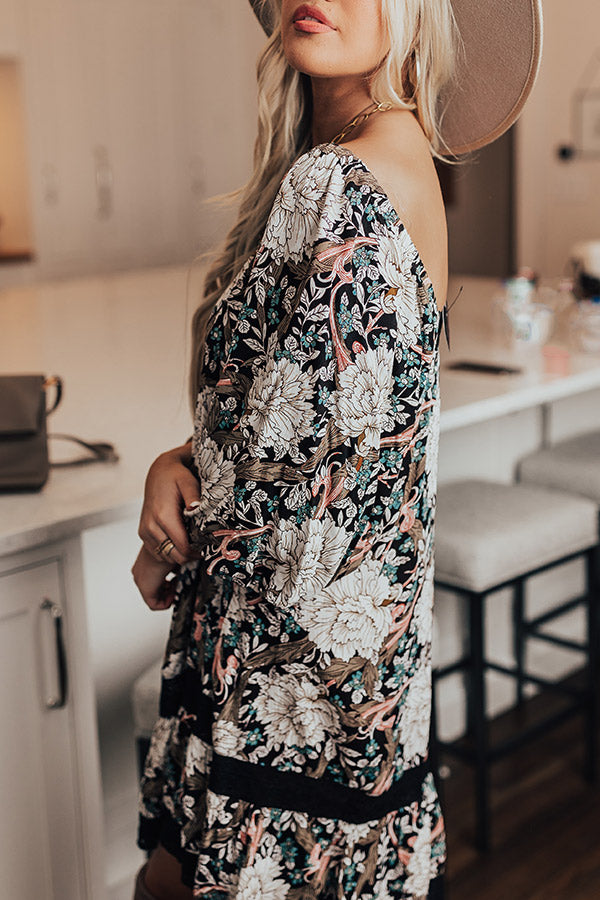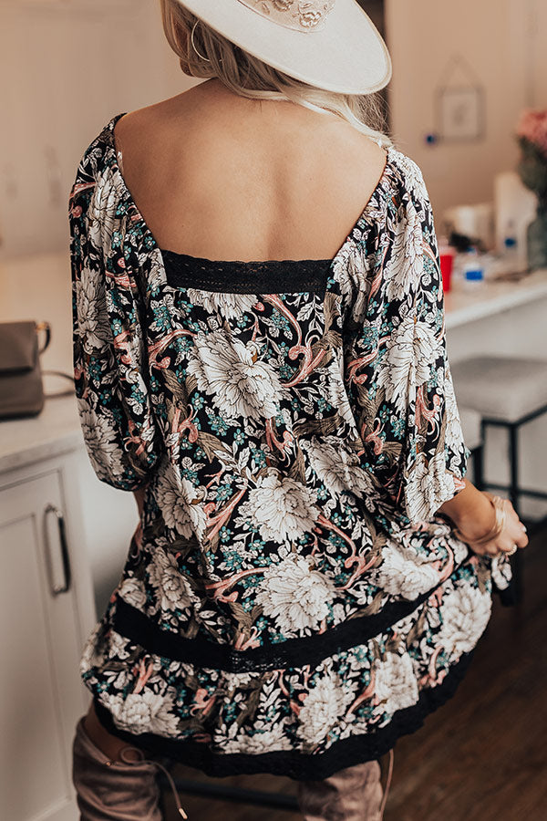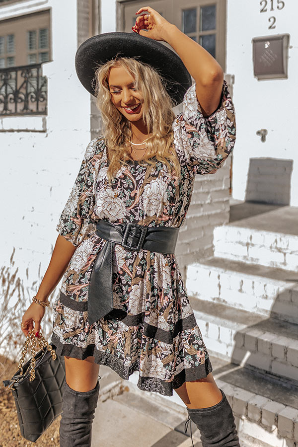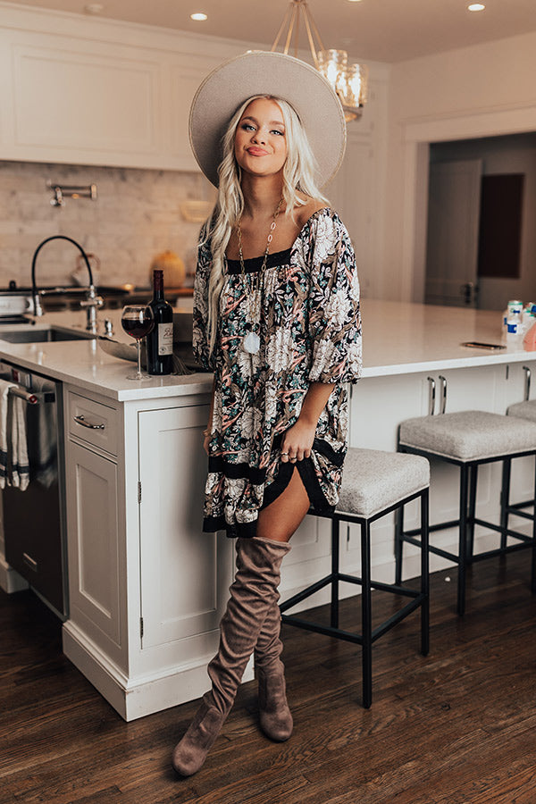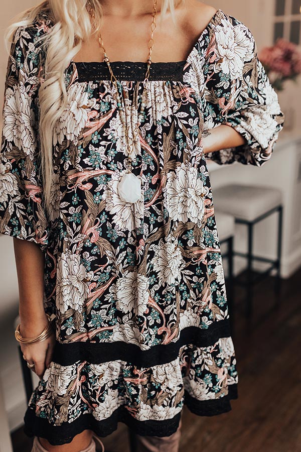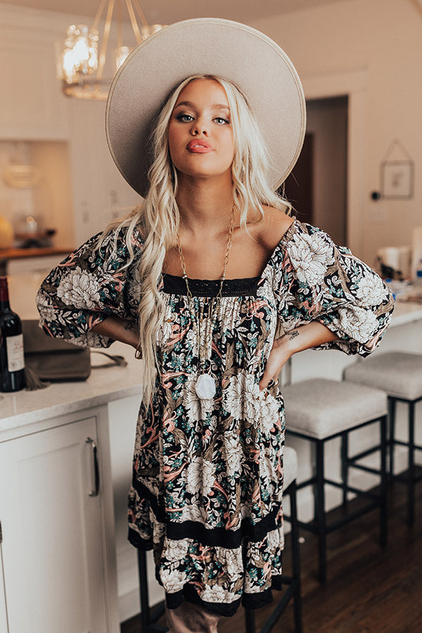 Twirl into style with our adorable black 'Amie' shift dress featuring lightweight flowy material pattered with a blue/green, cream, and blush hued floral print and rust accents, a square neckline and upper back, half bubble sleeves, and a relaxed silhouette that falls into a straight mid-thigh length hemline!