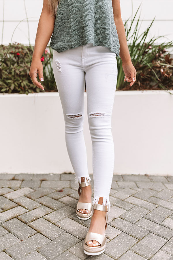 These white distressed skinny jeans have a mid-rise fit, a great stretchy feel, a raw cut hem & distressing throughout.