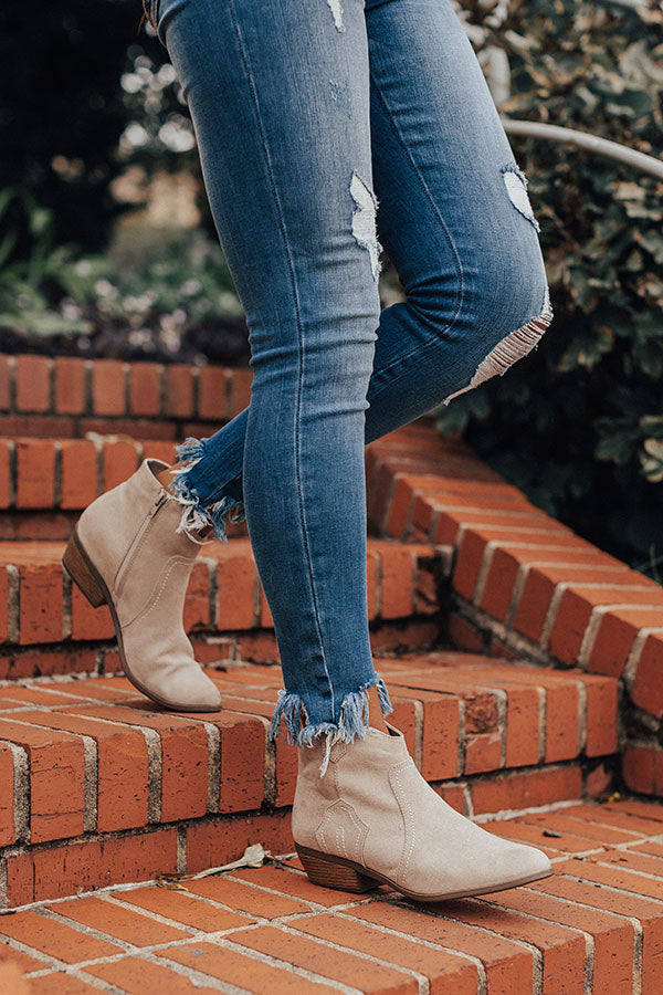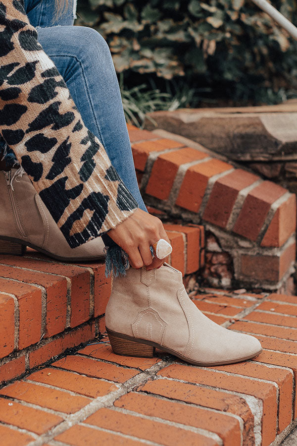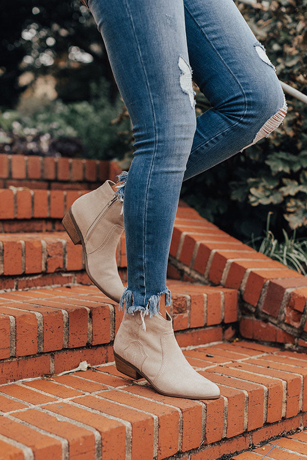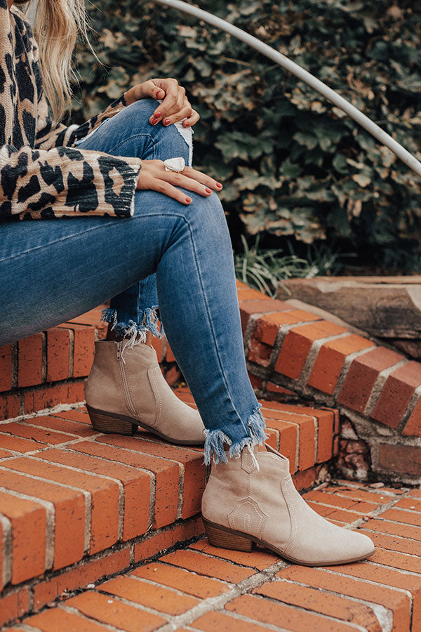 Step up your fall shoe game with "The Annabeth Bootie" featuring a stone colored faux suede material, 2-inch block heels, closed rounded toes, cowboy boot accent seams, and inside zippers!