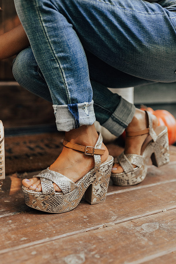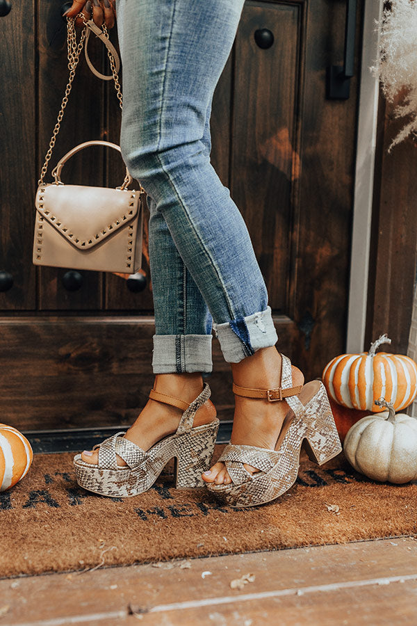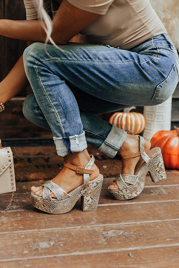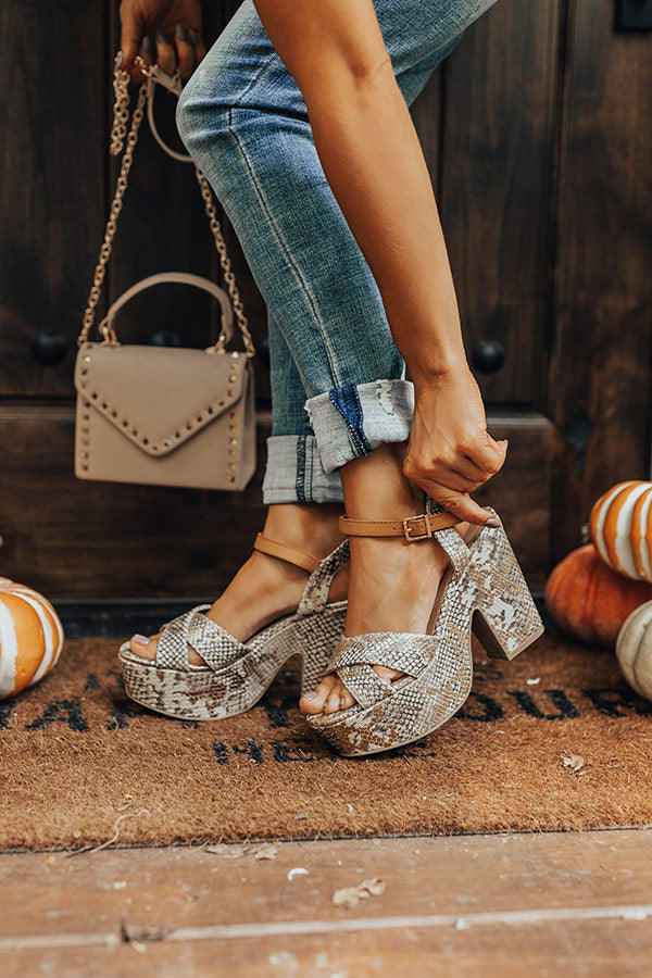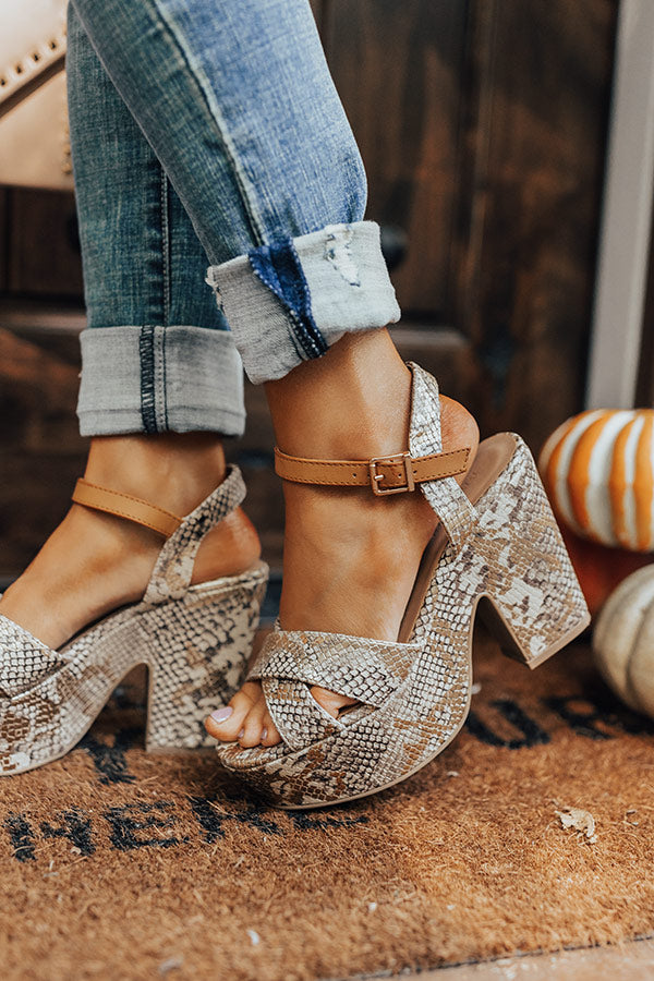 Make a fashionable statement with our cute chunky 'Antonia' heel featuring a natural hued snake print, rounded open toes with platform soles, two crossed over-the-foot straps, a buckled ankle strap, 3-inch block heels, and a lightweight silhouette! This heel runs more true to size.