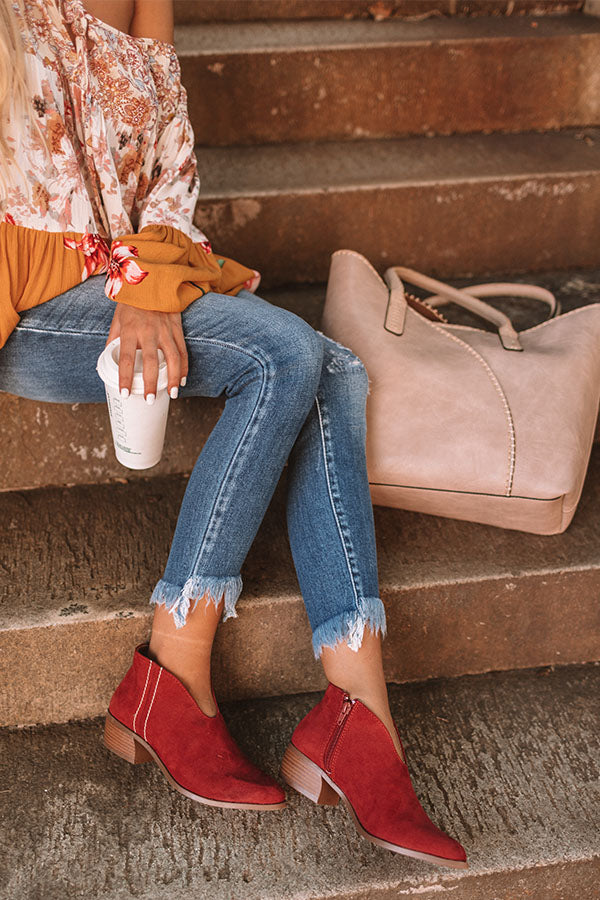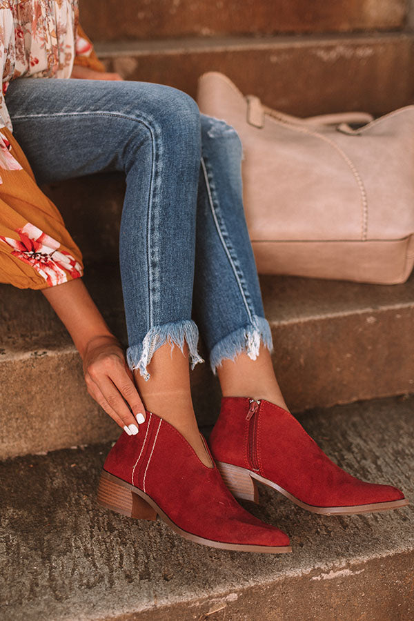 There is no better transitional bootie for summer to fall than "The Archer Bootie in Red" featuring a block heel, rounded closed toe, and inside ankle zipper!