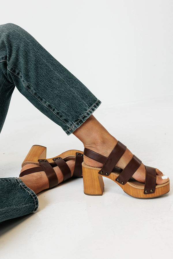 The perfect casual but elevated transitional shoe, our chestnut colored 'Arissa' heel features three faux leather over-the-foot straps, a rounded open toe, a 4-inch block heel with a platform sole, and a buckled ankle strap! This heel runs more true to size.