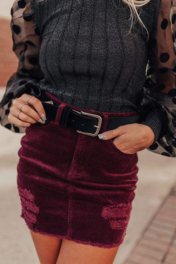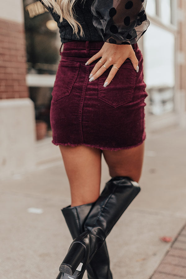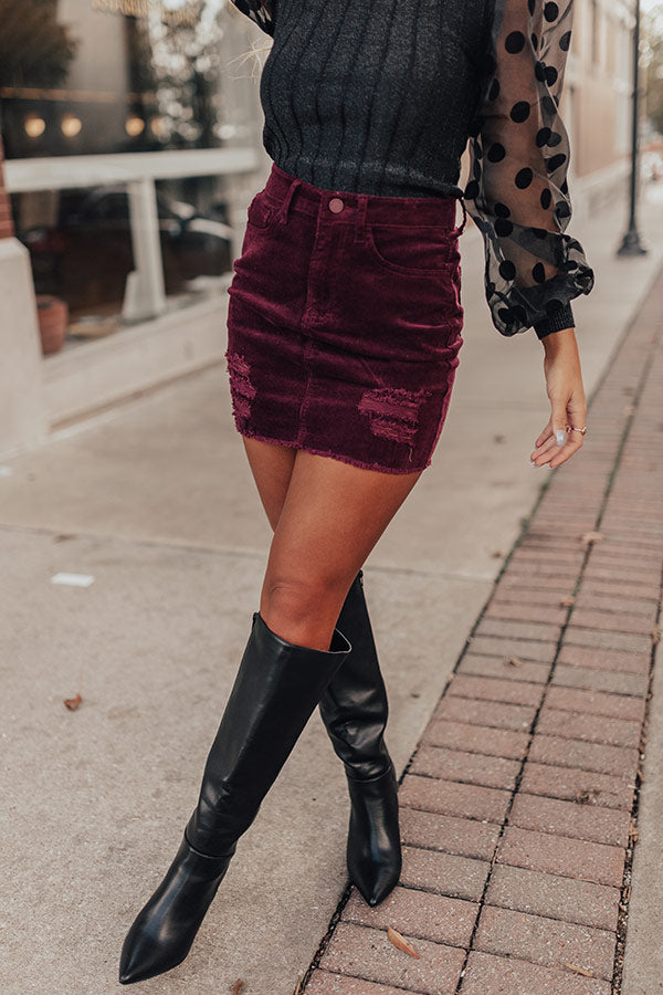 Strut with confidence in our windsor wine colored 'Ashton' skirt featuring velvety corduroy material with subtle distressed detailing, five pocket cuts, a hidden zip with a button closure, belt loops, and a straight form fit silhouette that falls into a straight upper-thigh length frayed hemline! Measurements