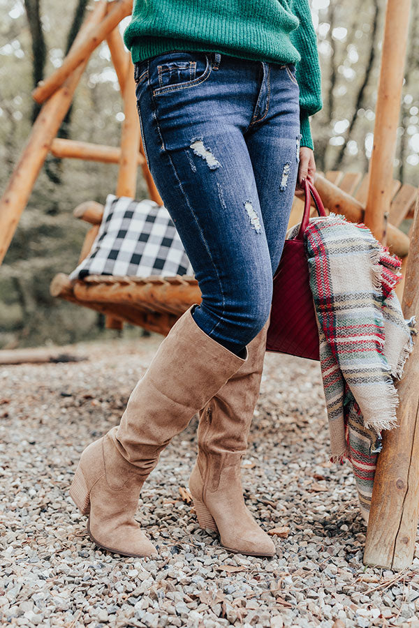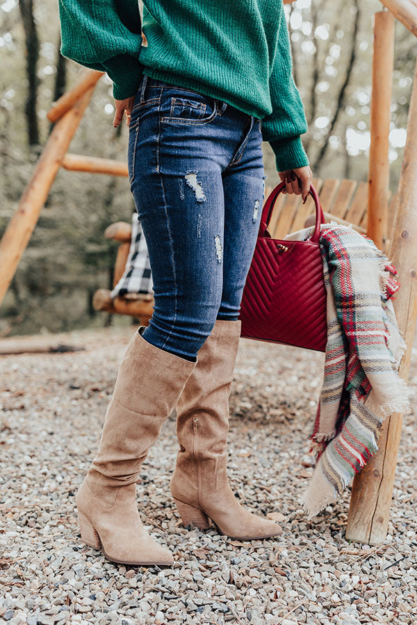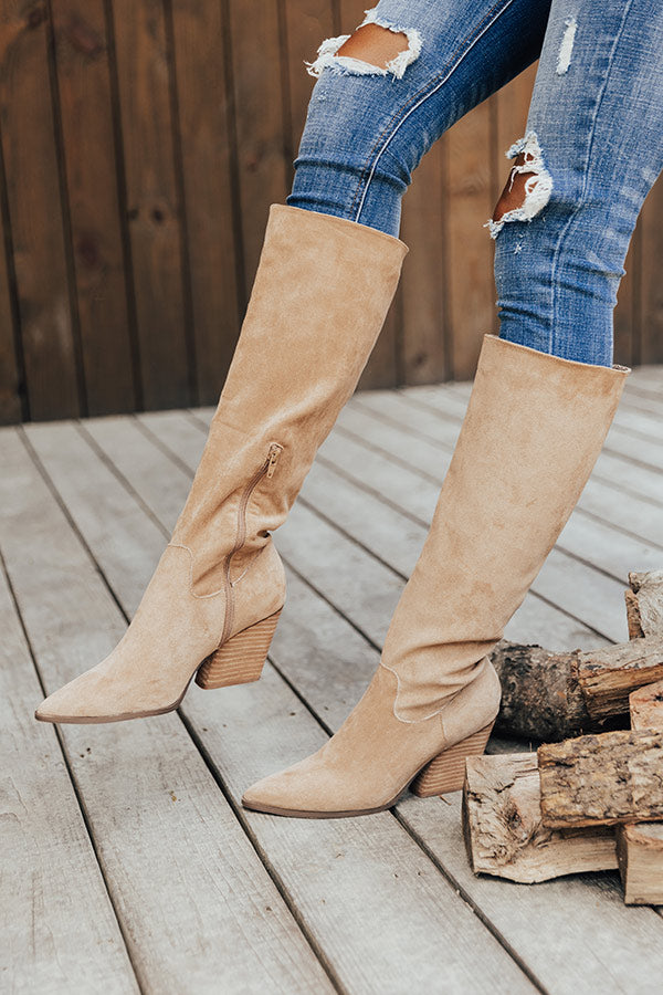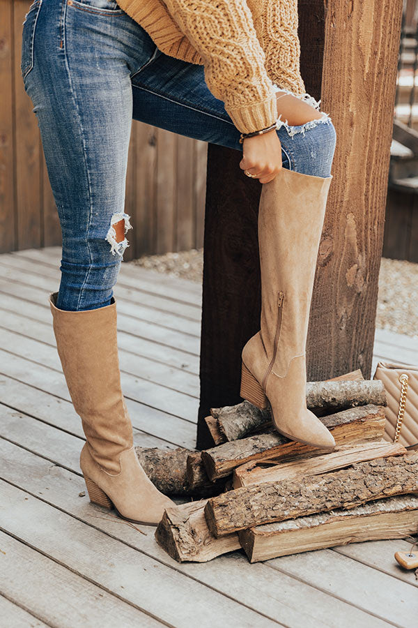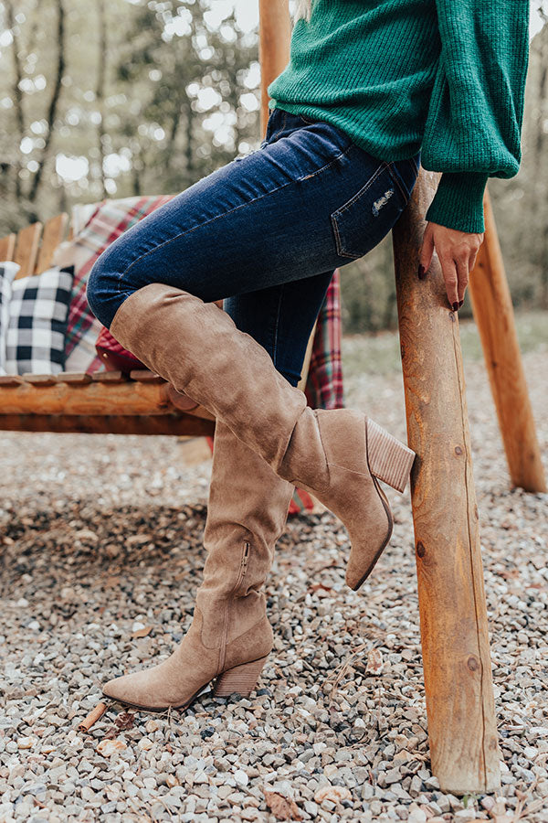 Put a little pep in your step with our gorgeous iced mocha colored 'Aura' boot featuring soft faux suede material, 3.5-inch block heels, pointed closed toes, a 13-inch calf width, inside zip closures, and a slouched lightweight below-the-knee silhouette! For a more comfortable fit, we recommend ordering a 1/2 size up from what you typically wear. For example, if you normally wear a size 7, we recommend ordering a size 7.5.