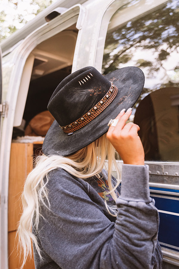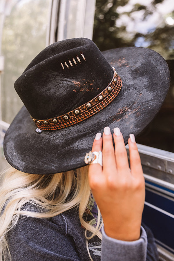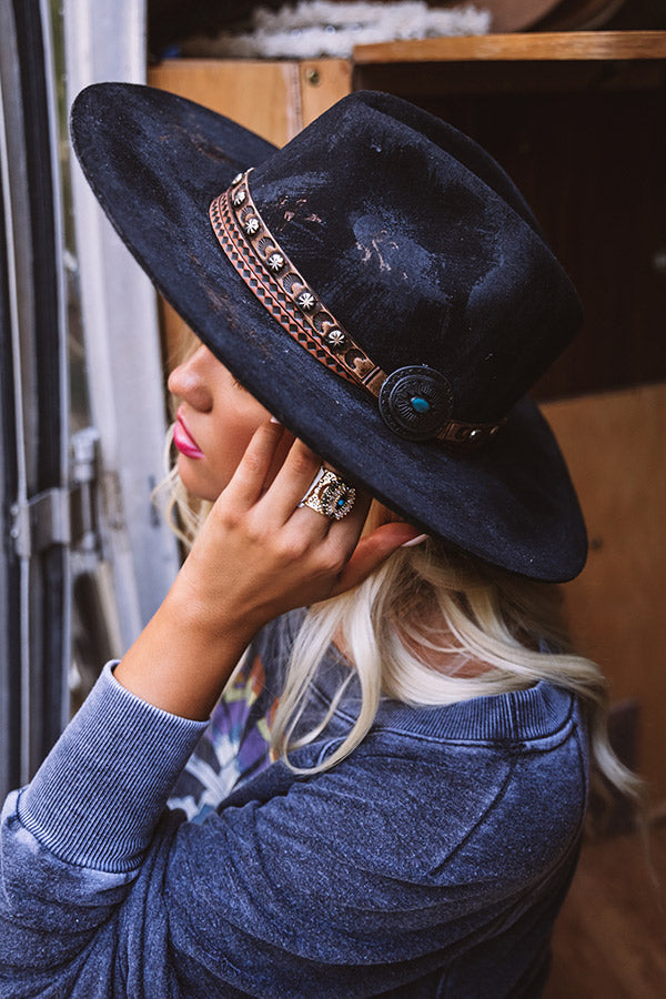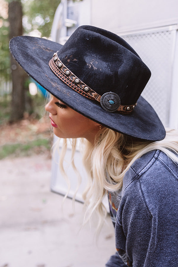 Complete your OOTD in style with our adorable black "Austin" fedora featuring lightweight wool material with distressed detailing, a stiff brim, and a wide patterned accent band with a turquoise stone concho!