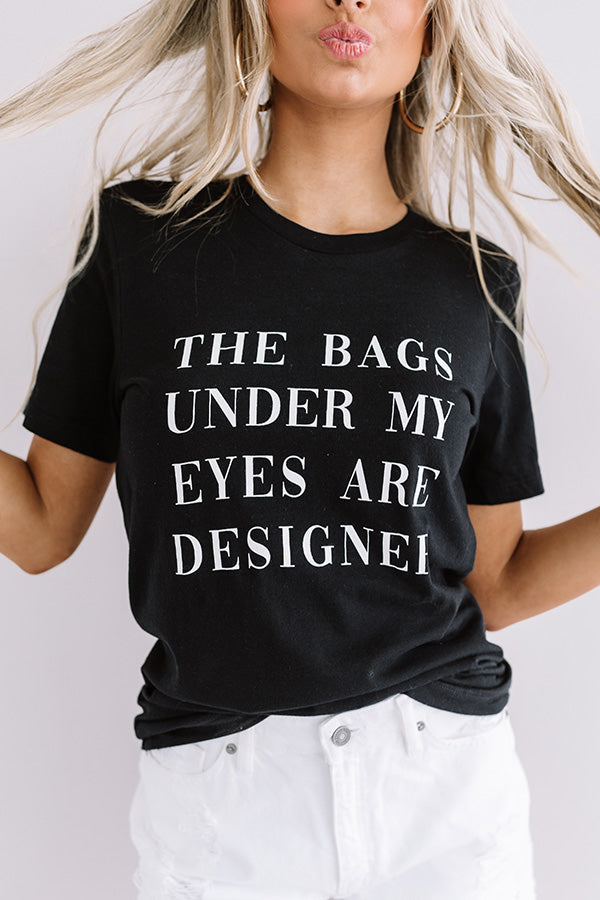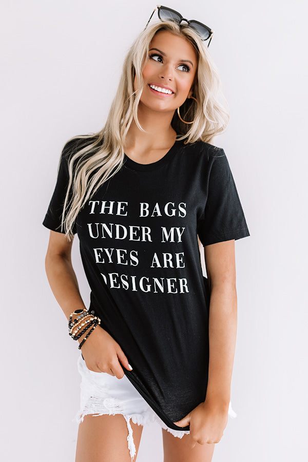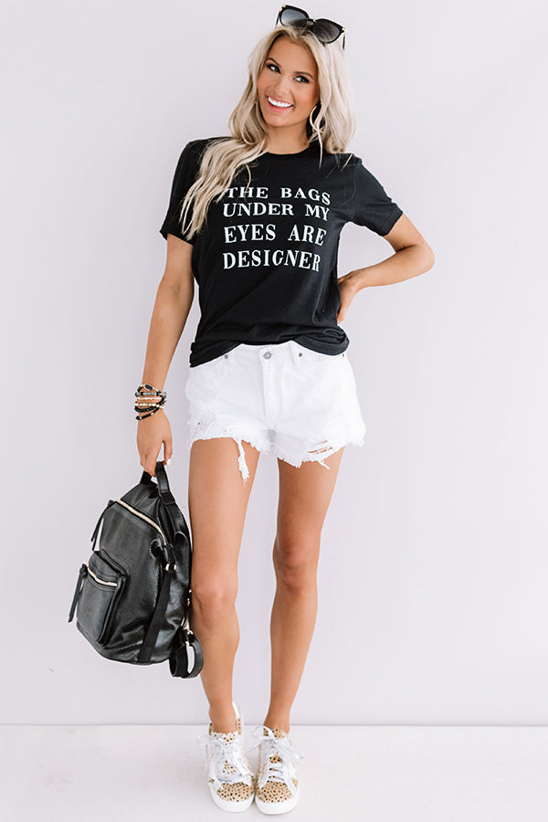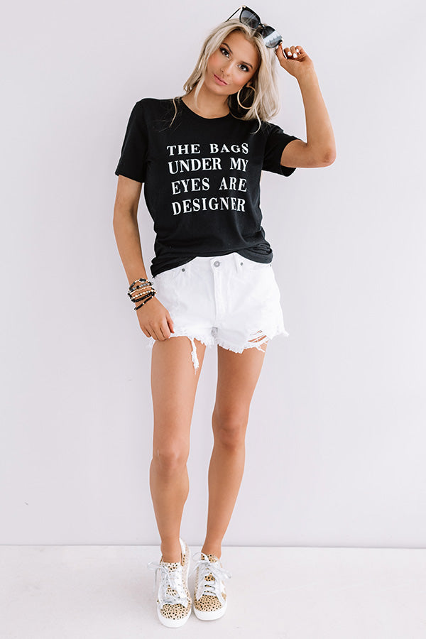 Be chic and comfy at the same time with our black "The Bags Under My Eyes Shift Tee" featuring soft lightweight material, a high rounded neckline, short looses sleeves, white block lettering on the front, and a relaxed silhouette that falls into a straight hemline! You can style this cutie a variety of ways, like with some distressed white shorts, sunnies, and trendy leopard sneakers, but you can also dress it up with some light wash flares, "The Allen Wedge in Black," and our "First Class Forever Quilted Crossbody in White!" Measurements