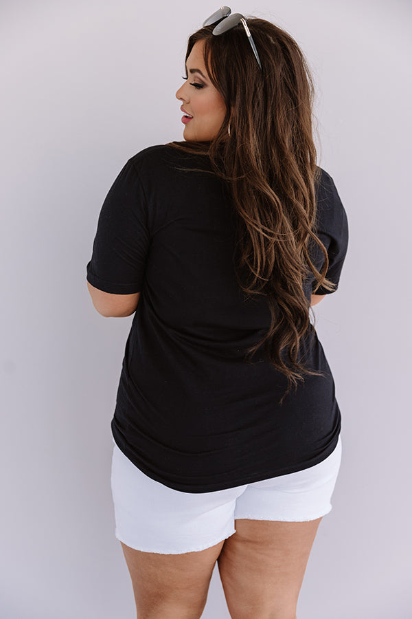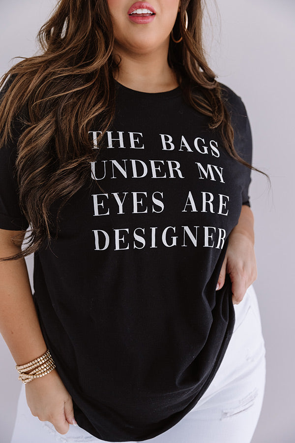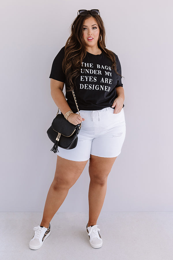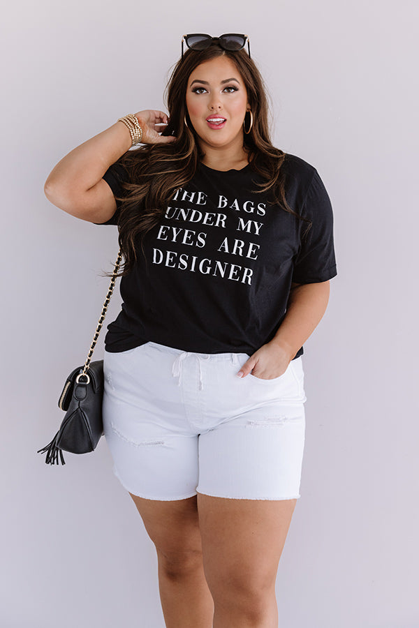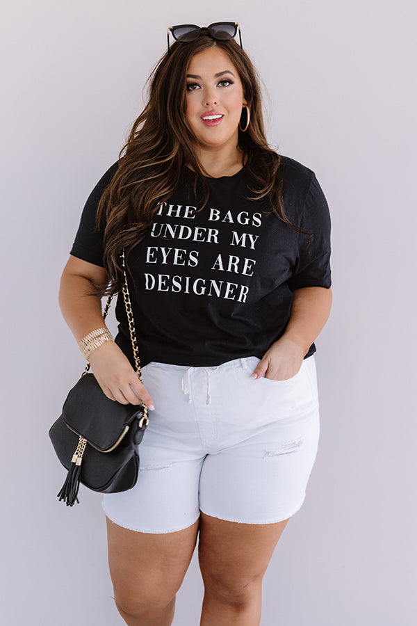 Plus Size - Be chic and comfy at the same time with our black "The Bags Under My Eyes Shift Tee" featuring soft lightweight material, a high rounded neckline, short looses sleeves, white block lettering on the front, and a relaxed silhouette that falls into a straight hemline! You can style this cutie a variety of ways, like with some distressed white shorts, sunnies, trendy leopard sneakers, and a black crossbody, but you can also dress it up with some light wash flares and "The Allen Wedge in Black!"
