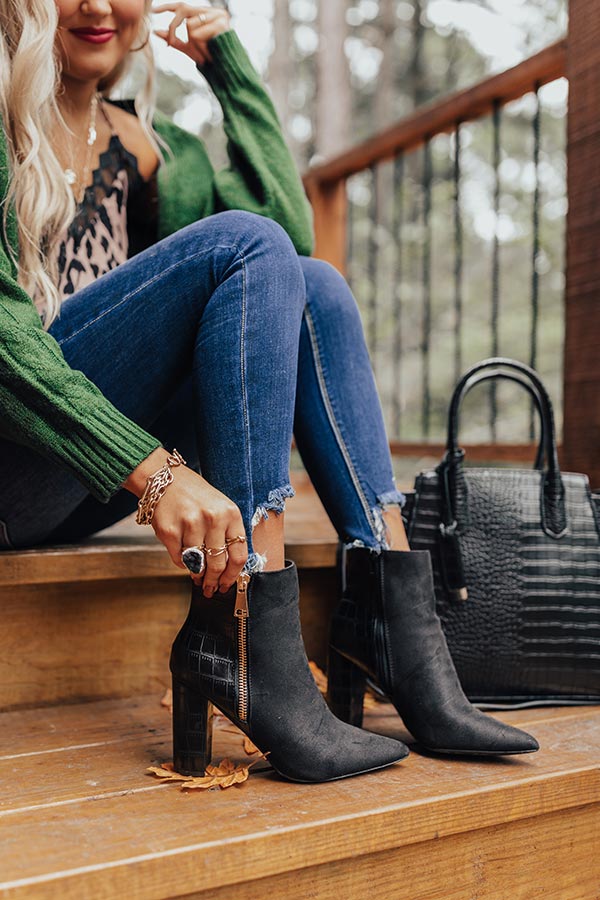 Strut through fall in style with our striking black "Bailee" bootie featuring soft faux suede material, pointed closed toes, 3.5-inch block heels with snake print texturing, inside zip closures and accent outside zippers, and a lightweight ankle high silhouette! For a more comfortable fit, we recommend ordering a 1/2 size up from what you typically wear. For example, if you normally wear a size 7, we recommend ordering a size 7.5.