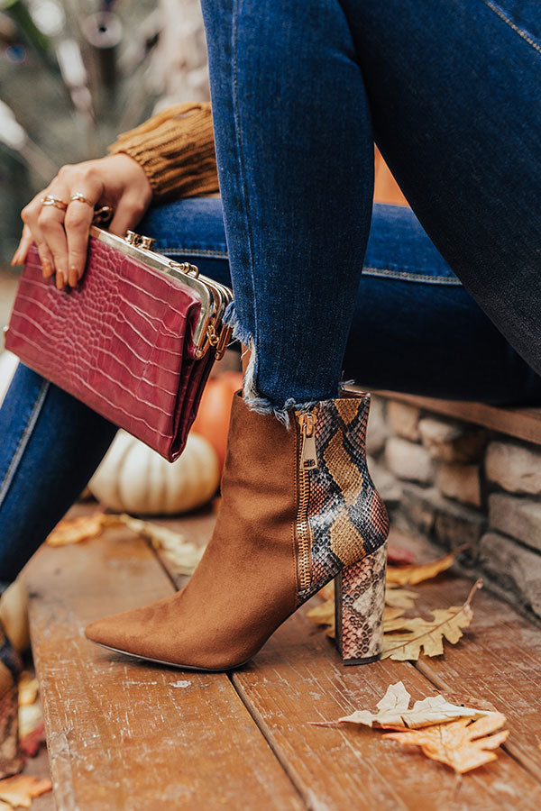 Strut through fall in style with our striking chocolate colored "Bailee" bootie featuring soft faux suede material, pointed closed toes, 3.5-inch block heels patterned with a bold colorful snake print, inside zip closures and accent outside zippers, and a lightweight ankle high silhouette! For a more comfortable fit, we recommend ordering a 1/2 size up from what you typically wear. For example, if you normally wear a size 7, we recommend ordering a size 7.5.