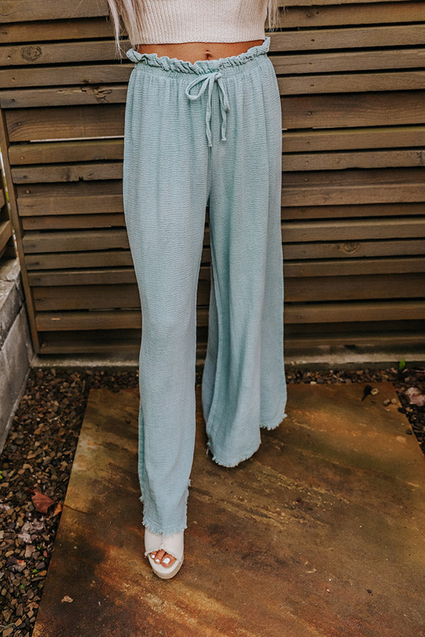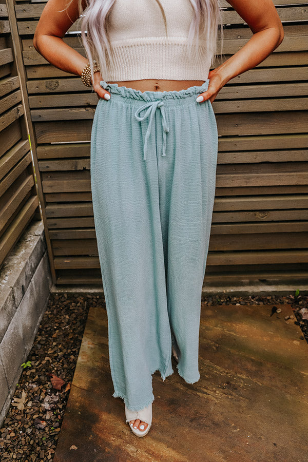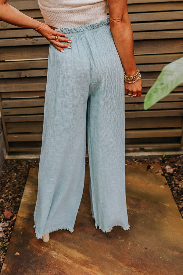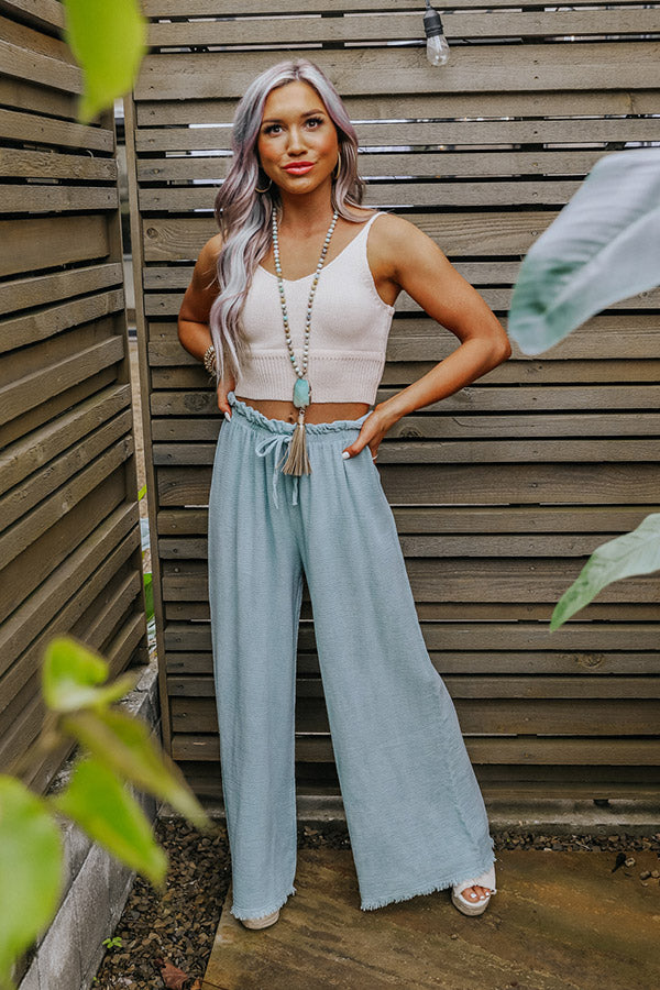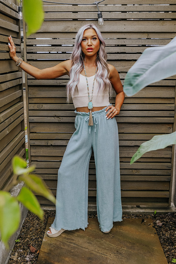 Keep cozy white staying cute with our fashionable ocean wave hued 'Banks' pants featuring lightweight and flowy linen-blend material, a high elastic waistline with a tie belt, and a relaxed silhouette that falls straight into raw-cut ankle-length hemlines! Measurements
