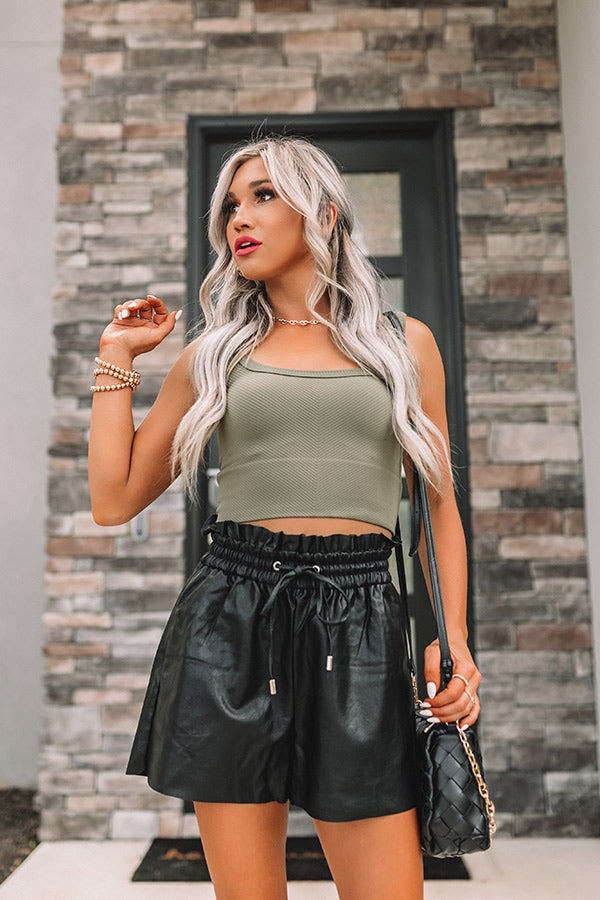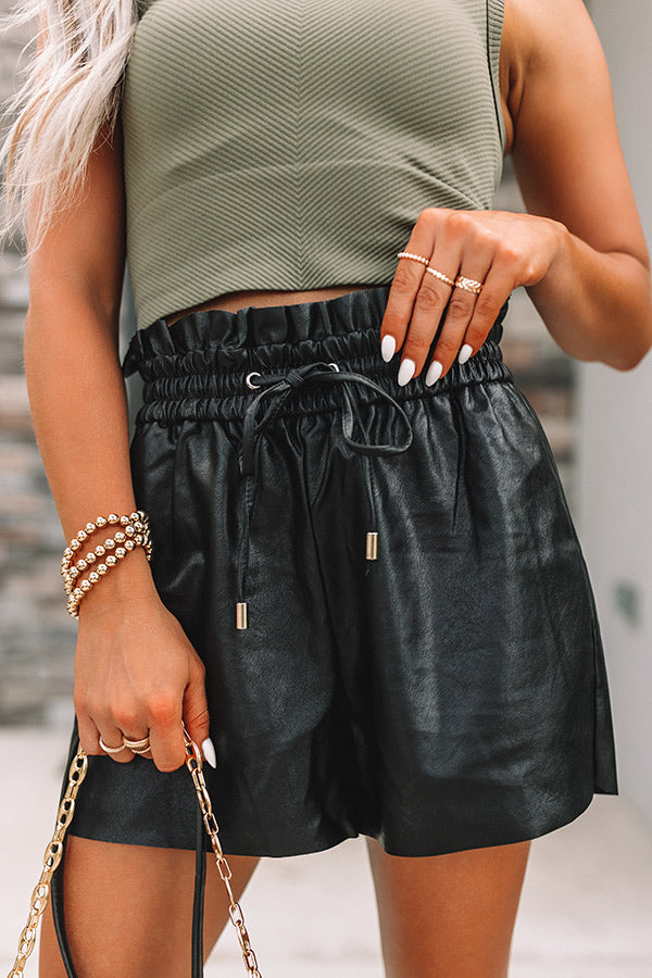 There is no better piece to take your from nine to wine than our chic black 'Barrymore' shorts featuring lightweight faux leather material, a high smocked waistline with ruffle trim detailing and a tie belt, accent side pockets, and a relaxed but flattering silhouette that ends in straight upper-thigh length hemlines! Measurements