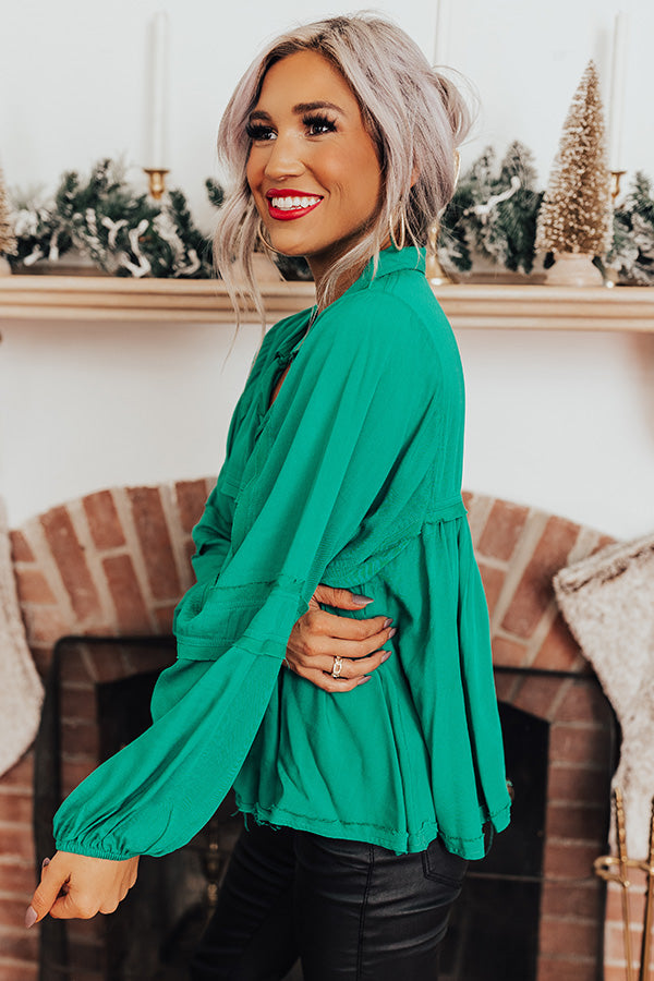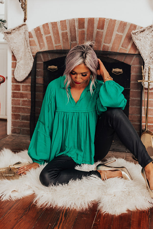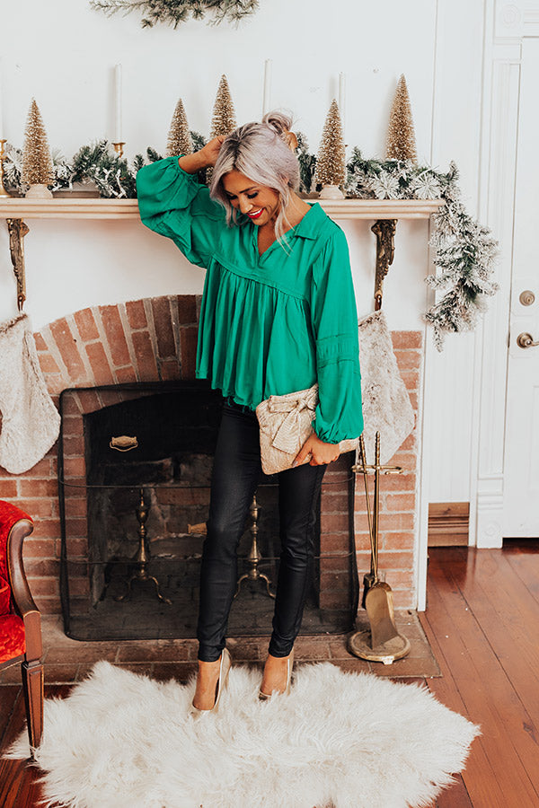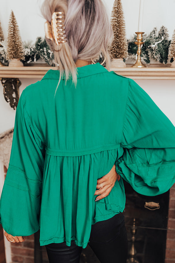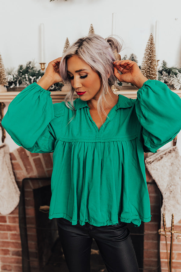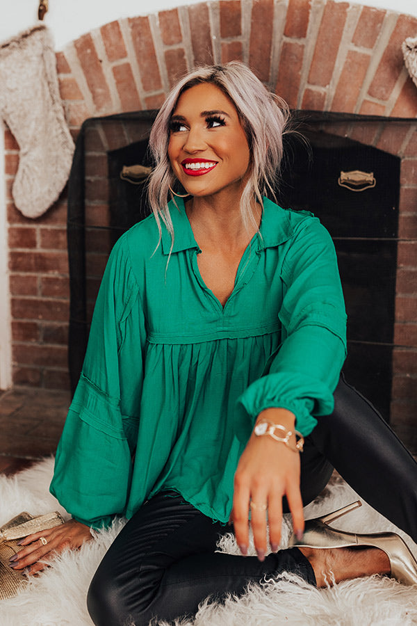 Step up your style game with our charming emerald colored 'Bayle' shift top featuring lightweight flowy material, a collared v-cut neckline, long bubble sleeves, exposed accent seams, and a relaxed babydoll silhouette that falls into a straight hemline! Measurements