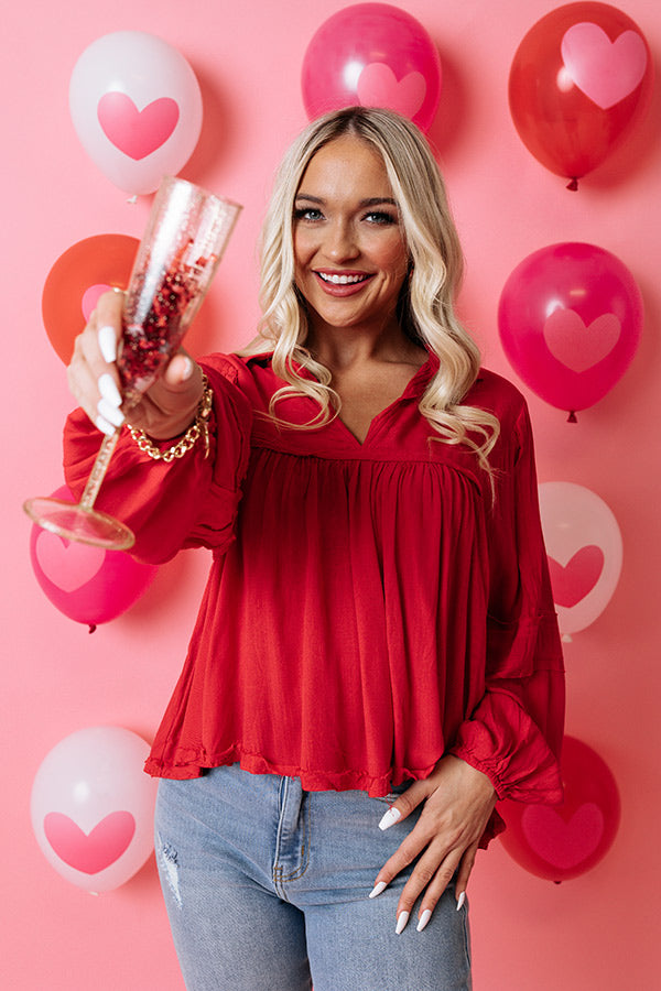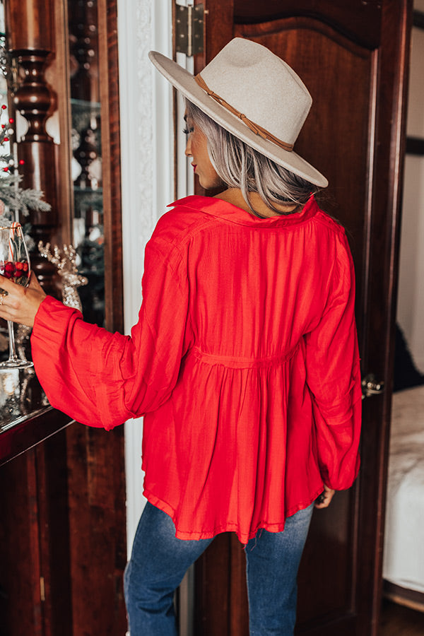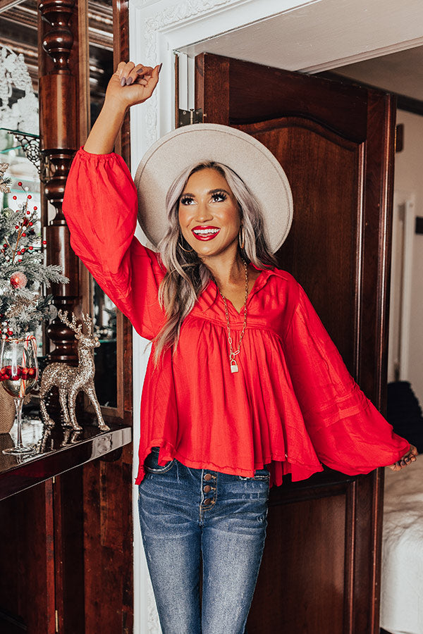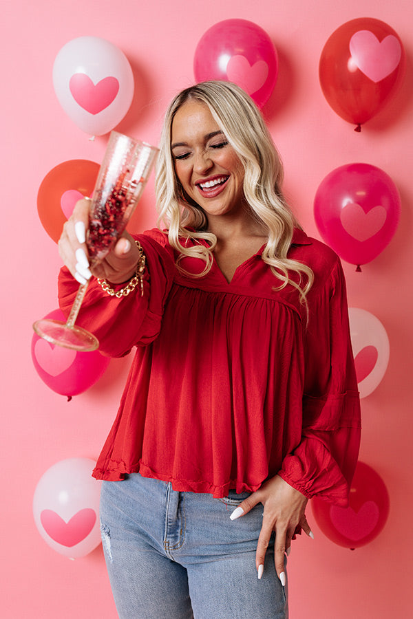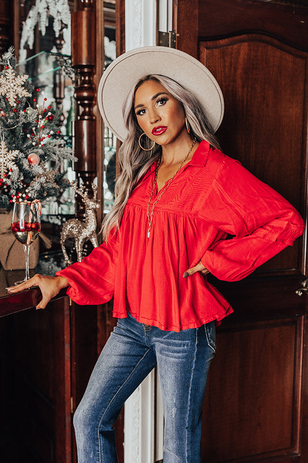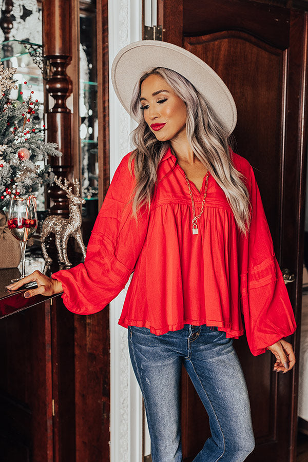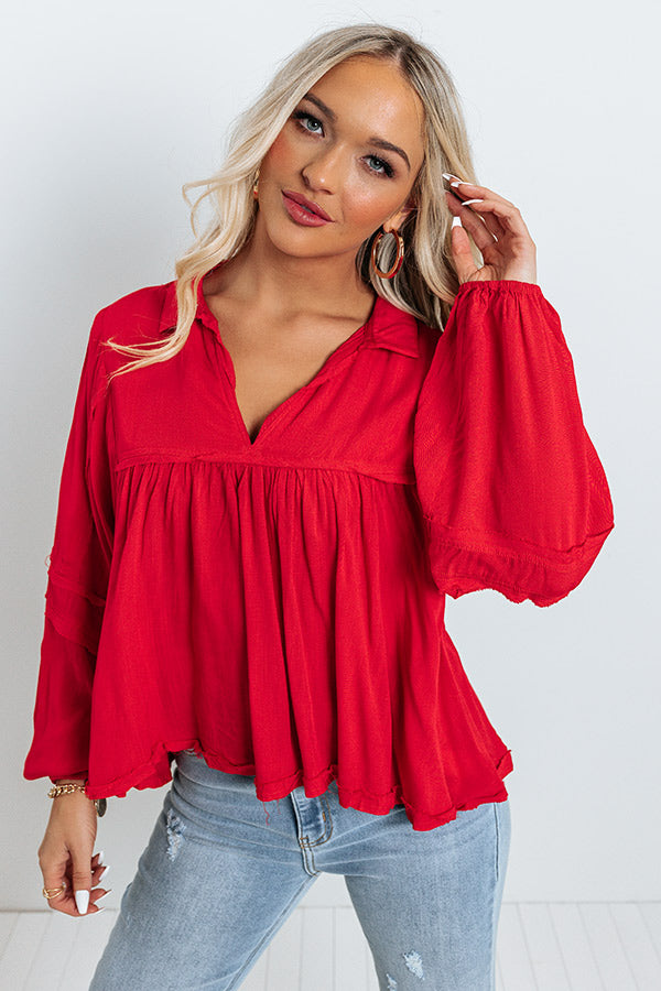 Step up your style game with our charming red 'Bayle' shift top featuring lightweight flowy material, a collared v-cut neckline, long bubble sleeves, exposed accent seams, and a relaxed babydoll silhouette that falls into a straight hemline!