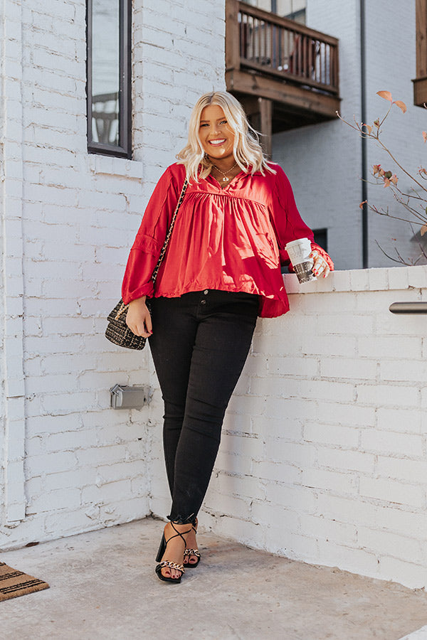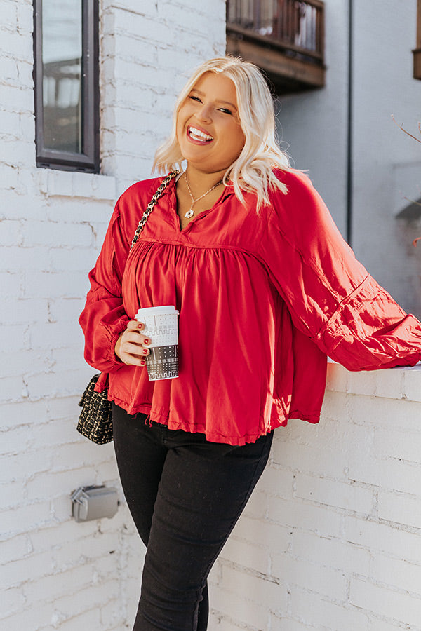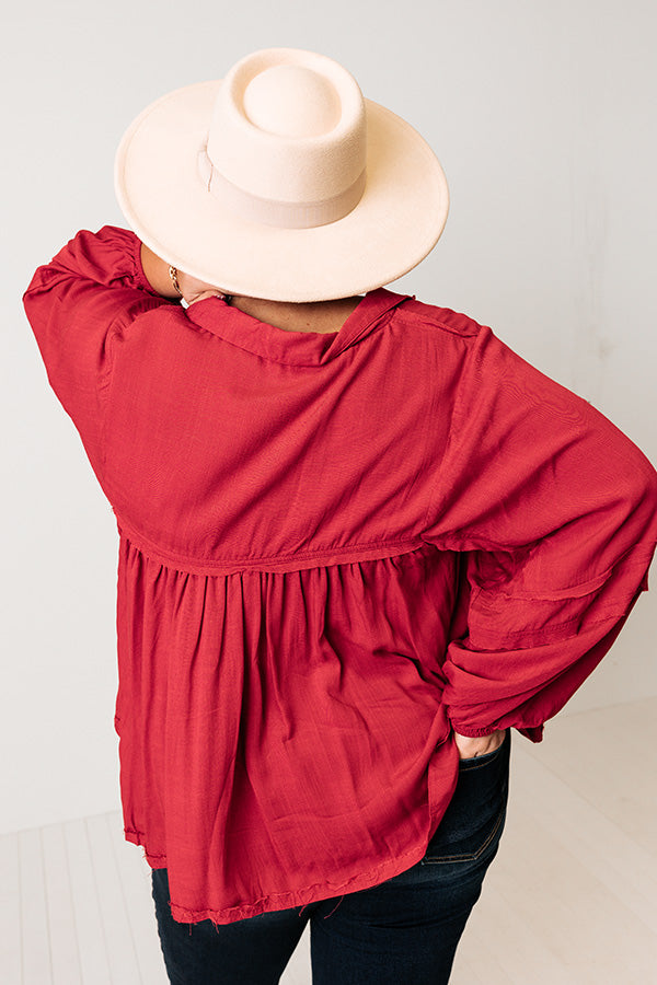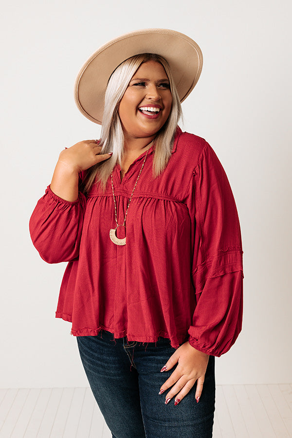 Step up your style game with our charming plus size wine colored 'Bayle' shift top featuring lightweight flowy material, a collared v-cut neckline, long bubble sleeves, exposed accent seams, and a relaxed babydoll silhouette that falls into a straight hemline!