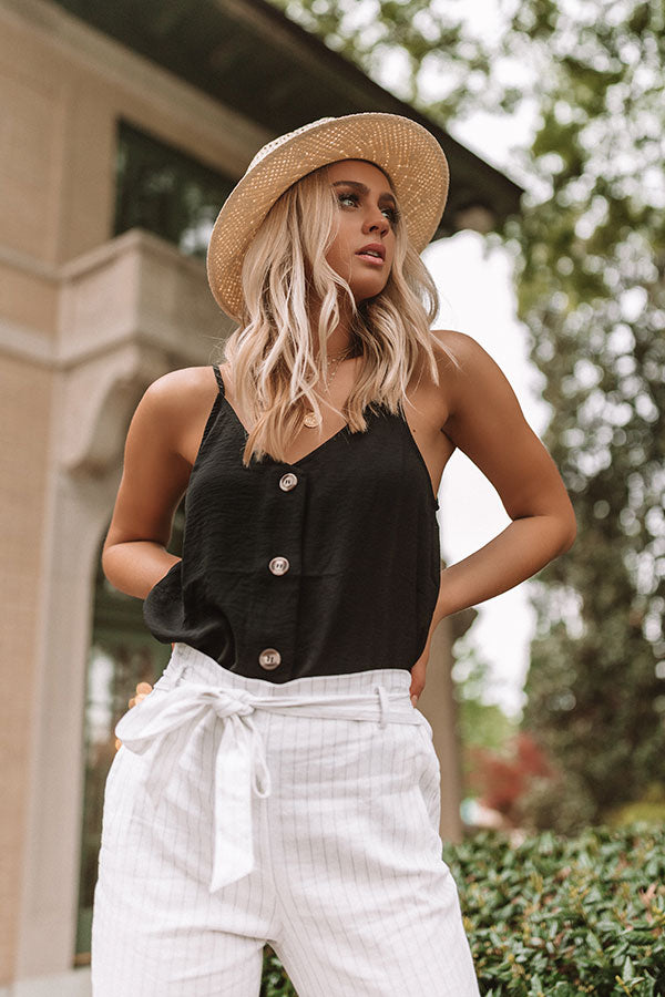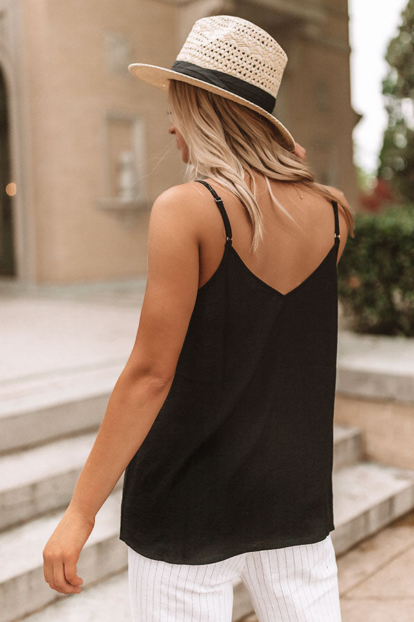 This beautiful black shift tank features adjustable spaghetti straps, a button up front, and a v-neck with a flowy fit! This glammed up basic can be styled with some pin striped trouser, a black wedge and a straw hat, or with a patterned skirt like our "Modern Marvels Leopard Skirt in Iced Latte" and "The Kennedy Heel in Red" for a remarkable summer outfit! Measurements