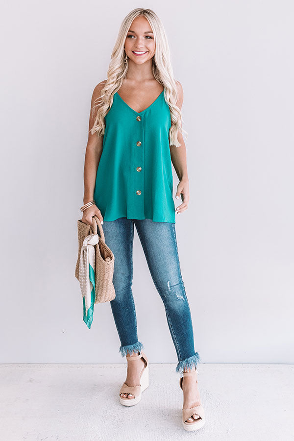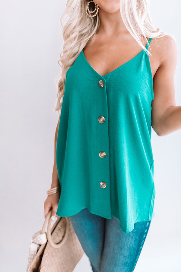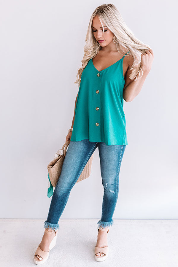 This beautiful turquoise shift tank features adjustable spaghetti straps, a button up front, and a v-neck with a flowy fit! This glammed up basic can be styled with some frayed jeans and a neutral wedge and tote, or with some patterned shorts like our "Sunshine Shorelines Swing Shorts in Flamingo" and "The Nova Wedge" for a remarkable summer outfit! Measurements