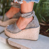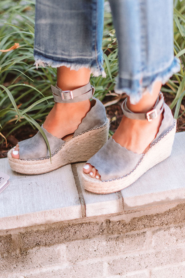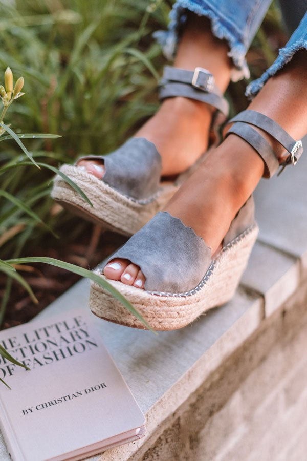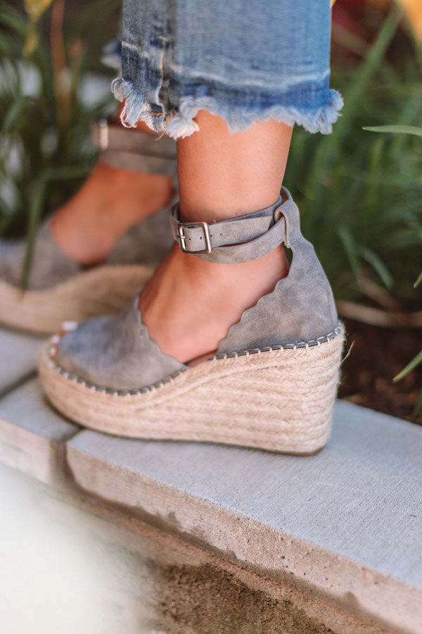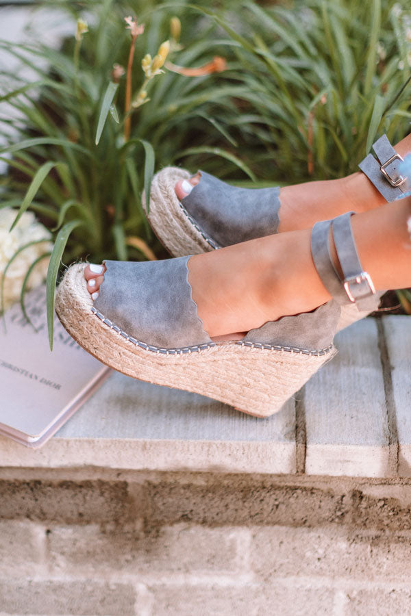 Be a high heel in a room full of flats with these grey espadrille wedges! The over the foot strap has a scalloped trim and the closed heel has a wrapped ankle strap with a buckle!