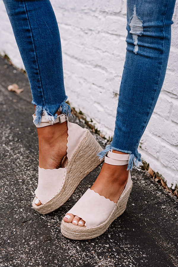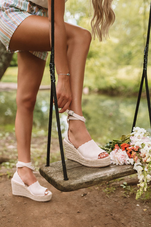 Be a high heel in a room full of flats with these light natural espadrille wedges! The over the foot strap has a scalloped trim and the closed heel has a wrapped ankle strap with a buckle!