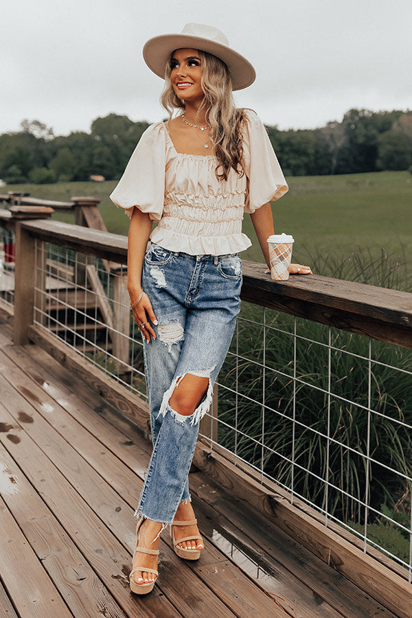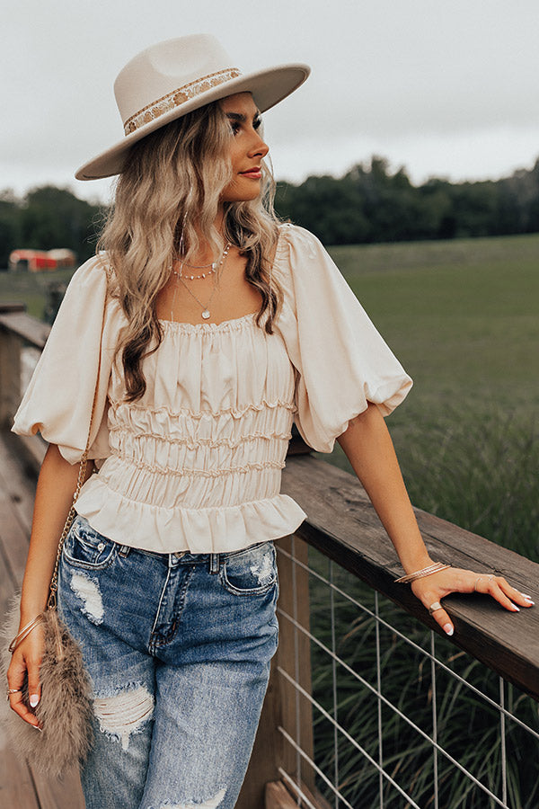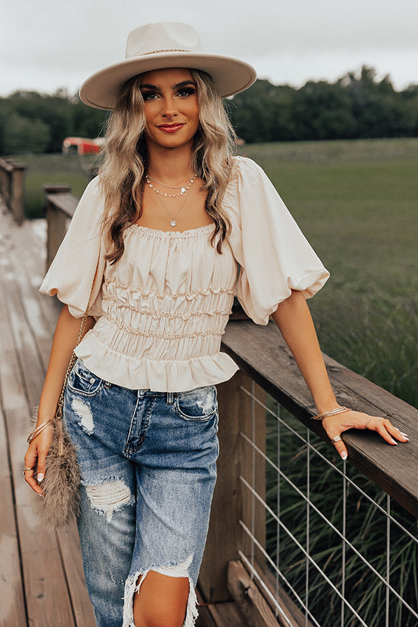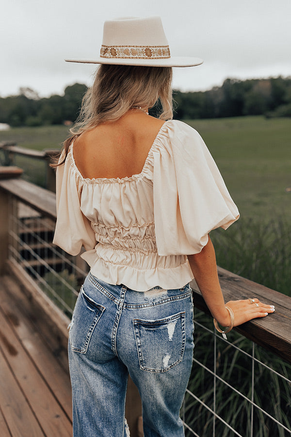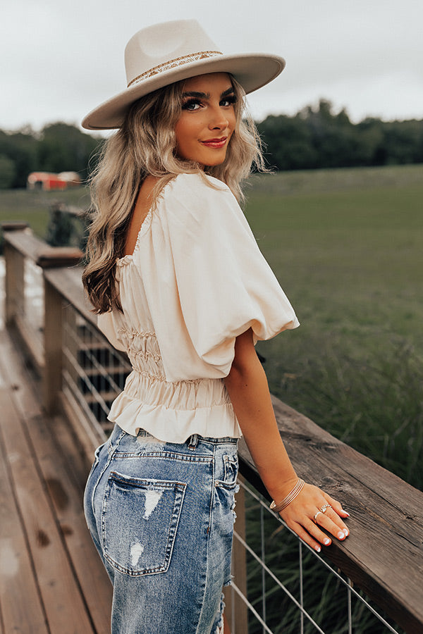 Step out in style in our charming cream colored 'Belmore' bodysuit featuring lightweight material with bunched detailing, a flattering square neckline and upper back, oversized puff half sleeves, and a figure hugging silhouette that ends in a ruffled hemline!