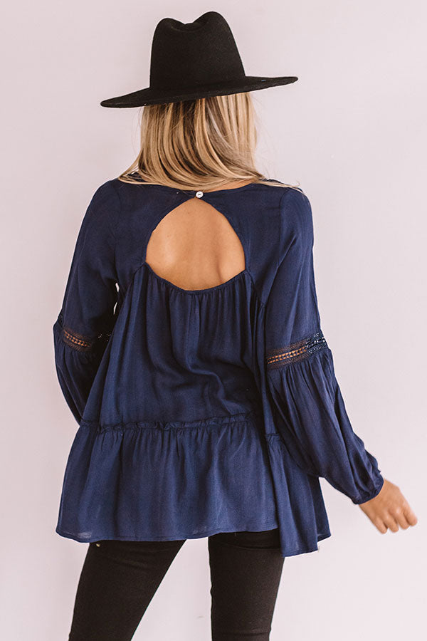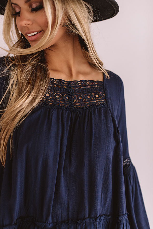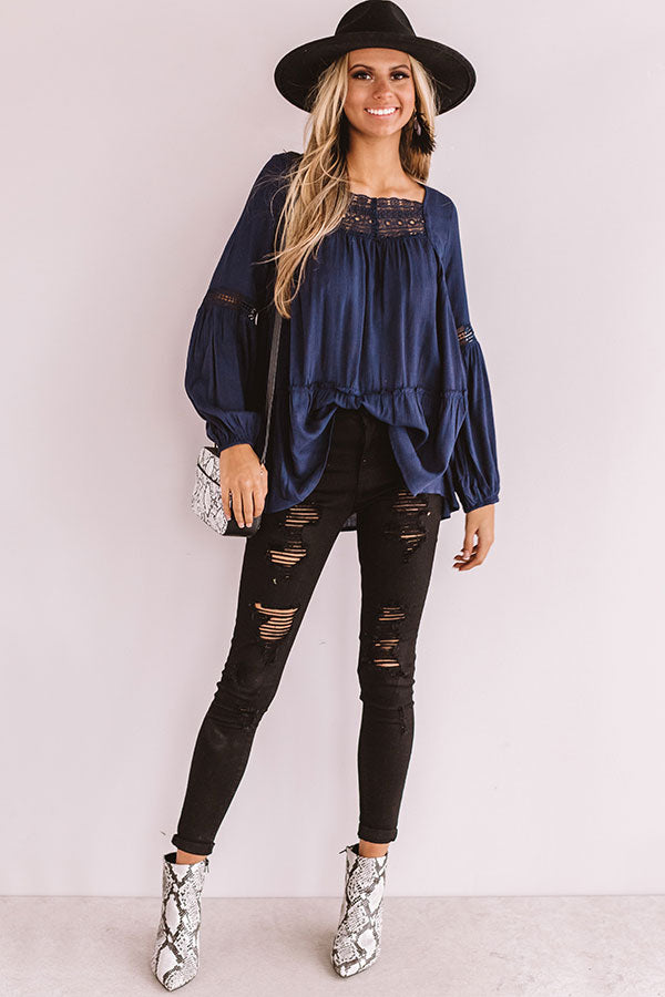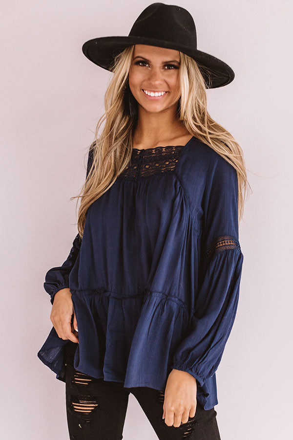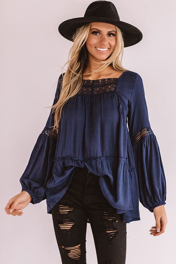 We know you have "the best intentions" in mind when you wear another top, but we think this navy colored shift top is the PERFECT piece! It features lightweight material, a wide square neckline with a crochet bodice, long loose sleeves with fitted elastic band cuffs, a cutout open back with a button closure, and a relaxed silhouette that falls into an uneven hemline! We have styled this piece with some distressed ankles skinnies, a black faux suede hat, and a snake print bootie and tote, but you can also wear it with some denim flares and our "Vacation Friendly Wedge in Navy!" Measurements