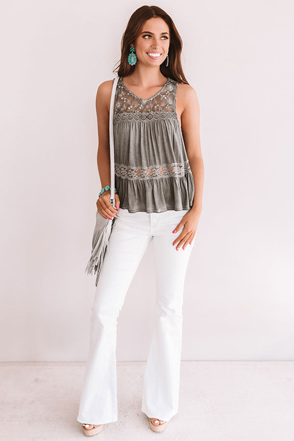 You will surely have "the best time" in this adorable charcoal colored tank with its lightweight material, intricate crocket detailing, semi-sheer 1-inch shoulder straps, a scooped neckline, and a relaxed silhouette that falls into a relaxed peplum hemline! This delicate piece pairs gorgeously with white flares, turquoise statement jewelry, a fringe crossbody, and wedges, but you can also wear it layered under a trendy kimono with some frayed black shorts, sandals, and sunnies for a variety of summer ready looks!