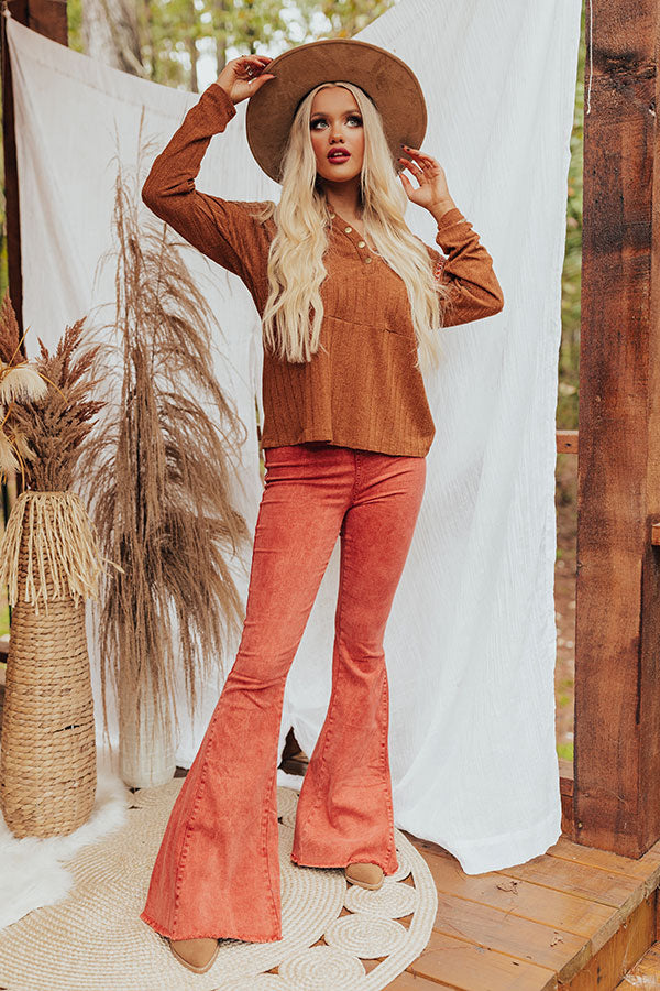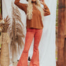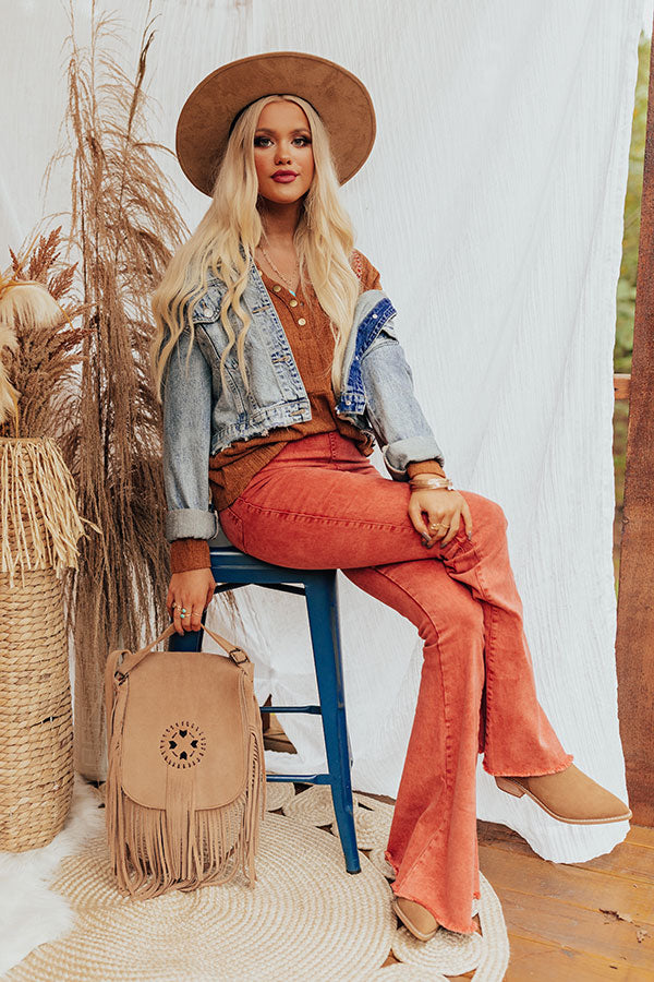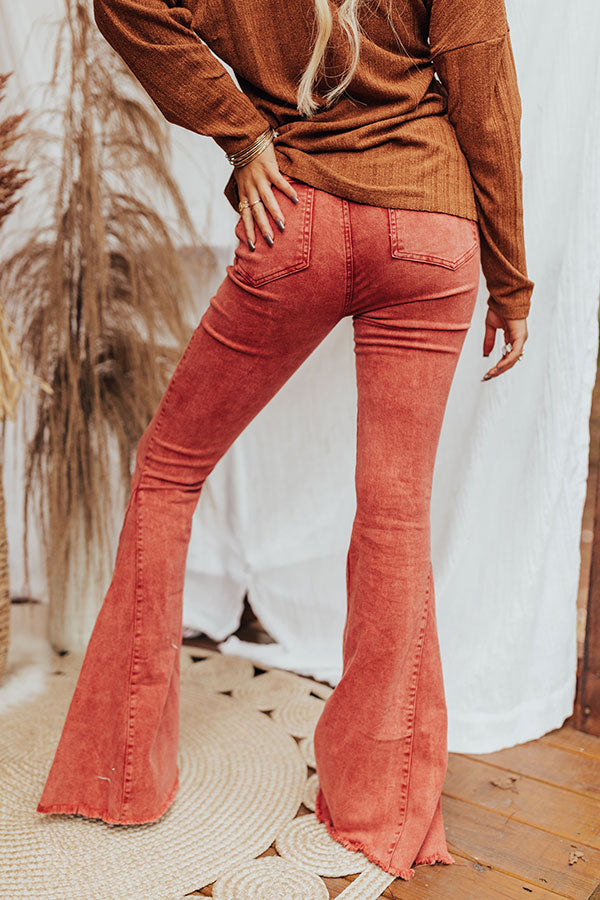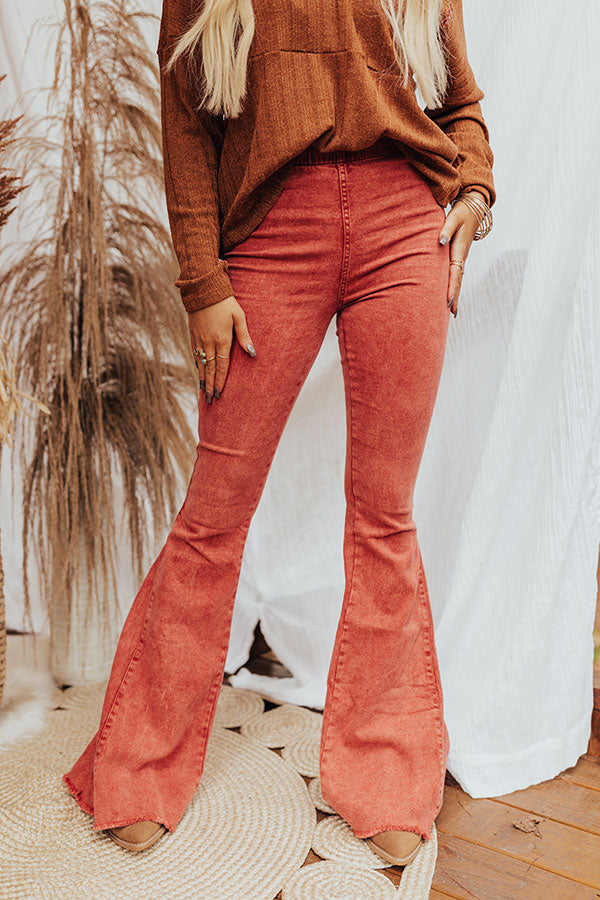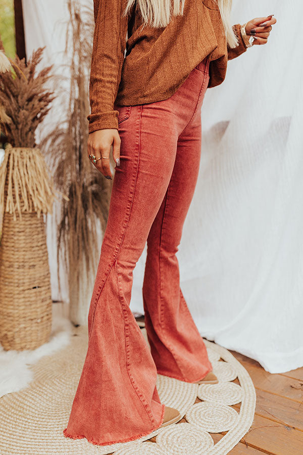Stay groovy all year round with our adorable aurora red colored "Blakely" pants featuring lightweight stretchy material, a high elastic waistline, distressed knee detailing, and a flattering form fitting silhouette that falls into ultra flared raw-cut floor-length hemlines! These retro bottoms will take your from season to season when you wear with your favorite open toed heel and tank top in the summer and with booties and a sweater in the fall!