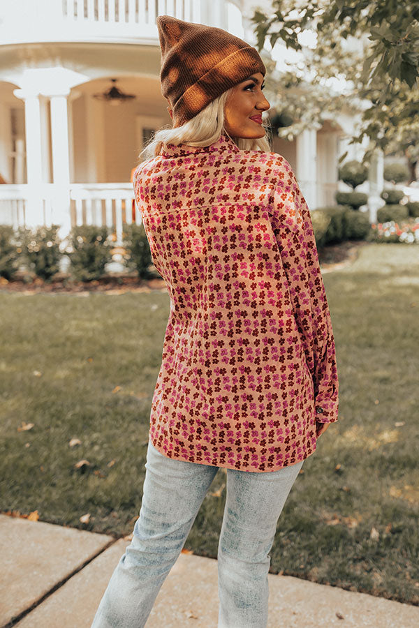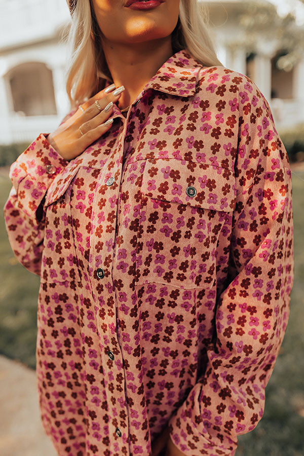 Let your style bloom in this beautiful top featuring lightweight corduroy material patterned with a pink hued flower print, a button up front with a collared neckline, long loos sleeves with button closure cuffs, two accent chest pockets with flap closures, and a relaxed silhouette that ends in a straight hemline!