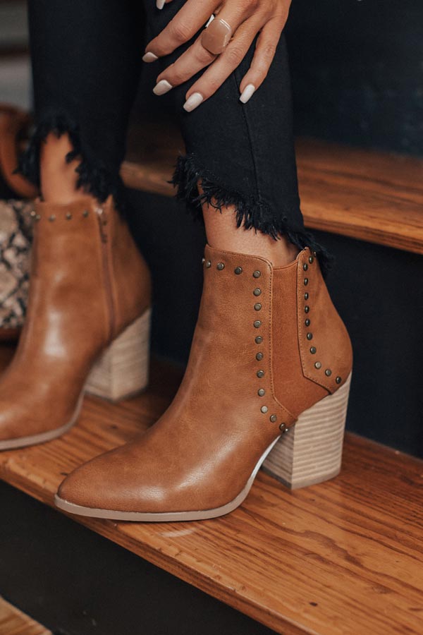 Slip into the colder weather in style with our black "Booker" bootie featuring sleek faux leather material, 3.5-inch block heels, pointed closed toes, studded detailing, inside zippers, and an above the ankle silhouette!