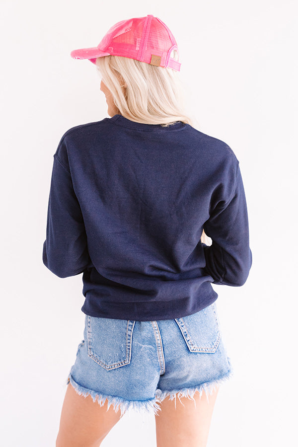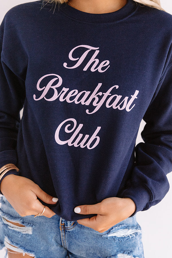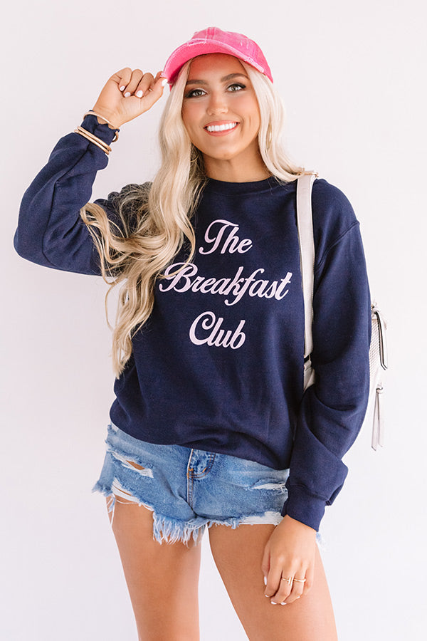 Show off your "breakfast club" status in style with this trendy navy sweatshirt featuring soft lightweight material, a high rounded neckline, cute pink script lettering on the front, long loose sleeves with fitted cuffs, and a relaxed silhouette that falls into a straight hemline! We have styled this cutie with some distressed denim shorts, a pink baseball cap, and a neutral sneaker and faux leather backpack, but you can also wear it with some white joggers and "The Mara Sandal in Pink!" Measurements