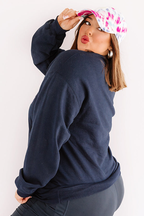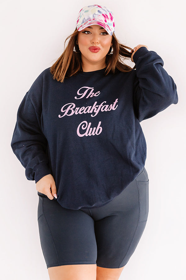 Plus Size - Show off your "breakfast club" status in style with this trendy navy sweatshirt featuring soft lightweight material, a high rounded neckline, cute pink script lettering on the front, long loose sleeves with fitted cuffs, and a relaxed silhouette that falls into a straight hemline! We have styled this cutie with some matching biker shorts, a tie dye baseball cap, and some neutral sneakers, but you can also wear it with some distressed white skinnies, "The Mara Sandal in Pink," and our "Oceanside Dreaming Woven Tote in Rose Quartz!" Measurements