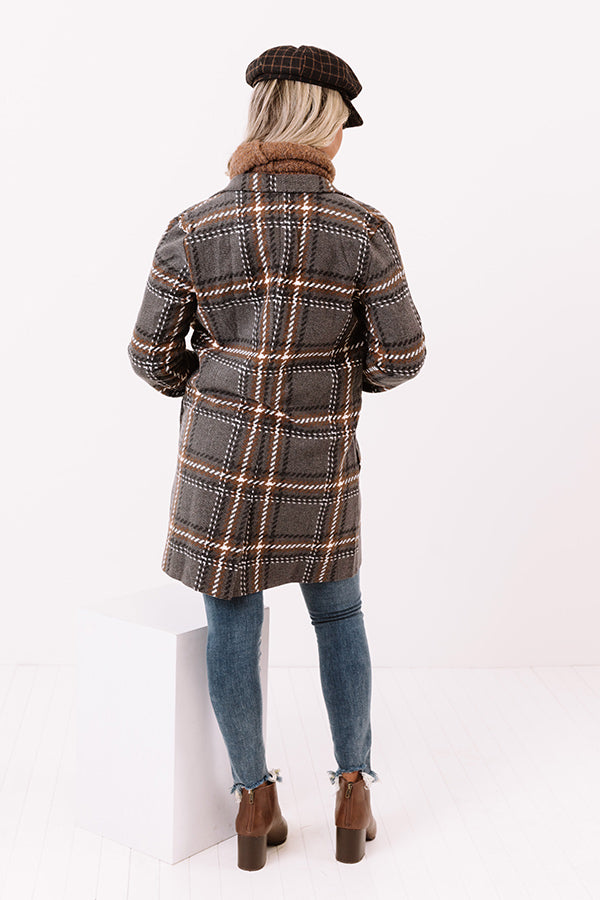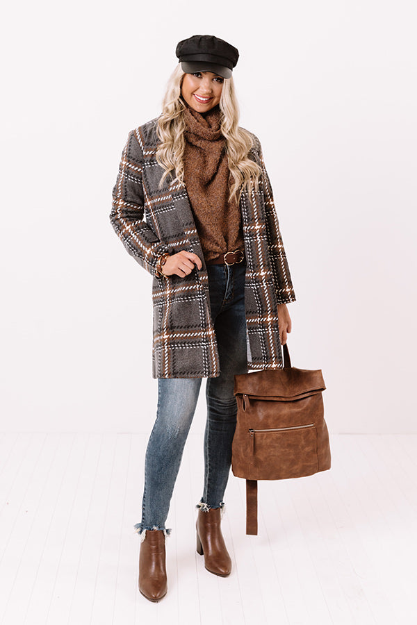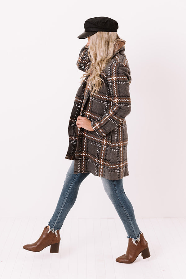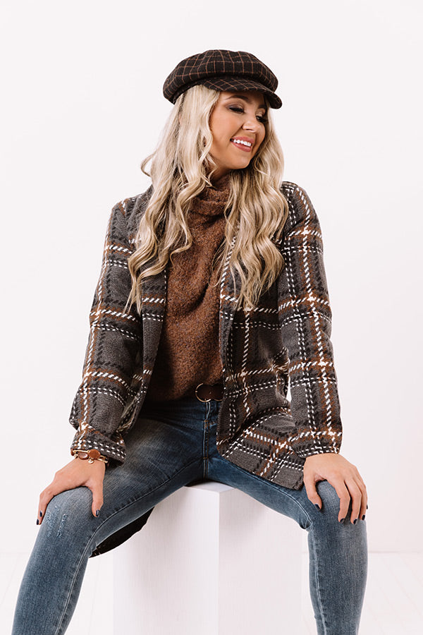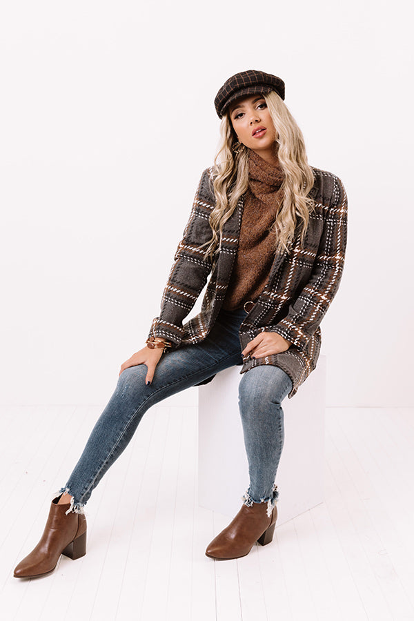 Shivering doesn't count as exercise, so bundled up and stay warm in our adorable charcoal hued 'Brexton Coat' featuring lightweight material patterned with a black, brown, and white plaid print, long loose sleeves, a collared neckline with accent v-notches, and a relaxed open front silhouette that falls into a straight mid-thigh length hemline! Measurements