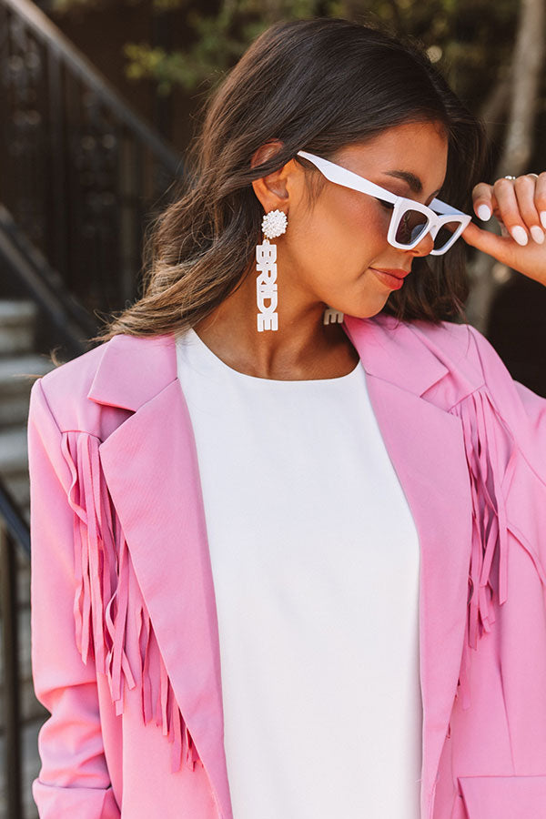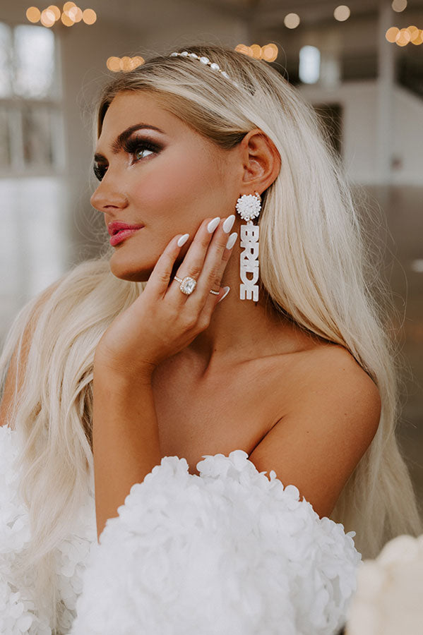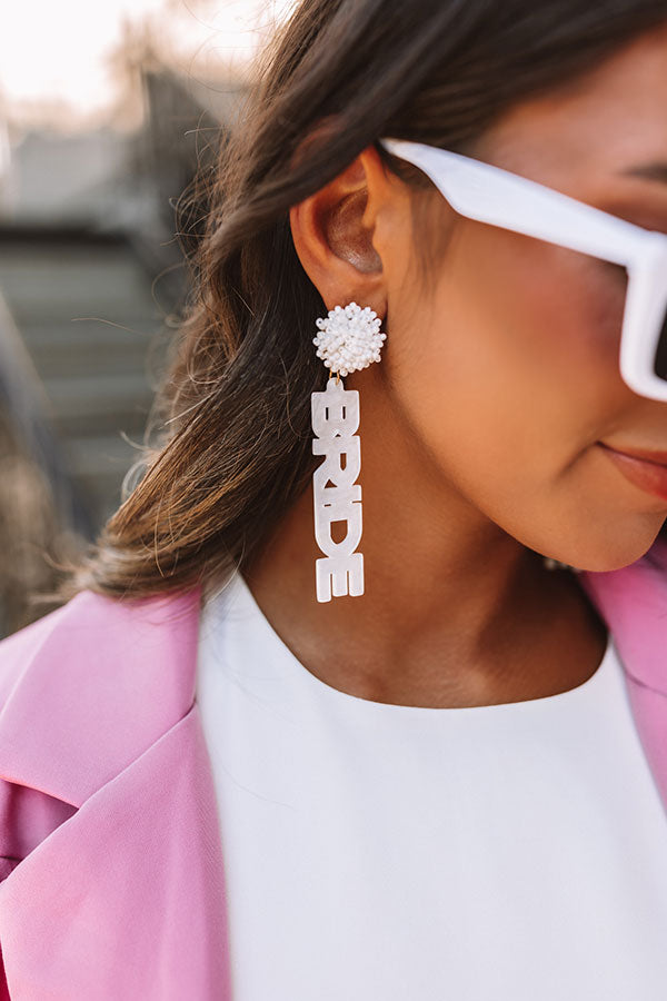 Make a statement in our chic white 'Bride Earrings' featuring beaded cluster studs and the word BRIDE in vertical resin lettering!