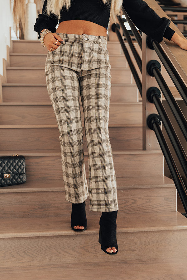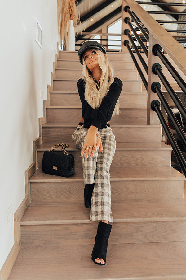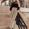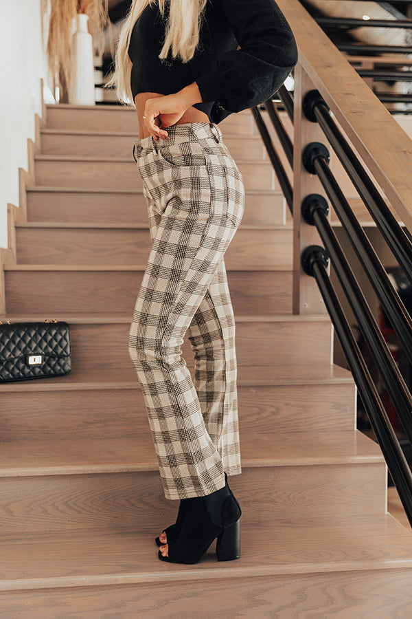 Yo won't find a cuter pair of bottoms for fall than our chic light birch hued 'Brooks' pants featuring lightweight material patterned with a black plaid print, a button closure waistline with belt loops, a classic four pocket cut, and a flattering figure hugging silhouette that falls into straight ankle-length hemlines!