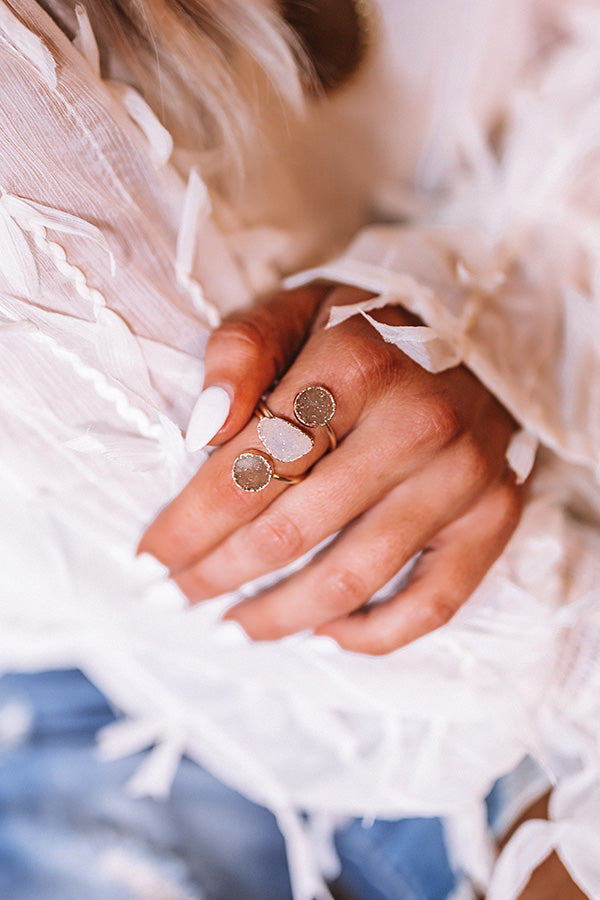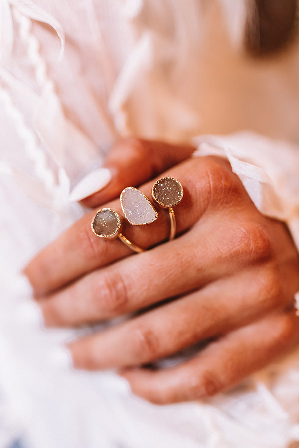 Add a beautifully bold statement to any look by accessorizing with the stunning "Burke" ring featuring a gold wrap band with three birch colored and iridescent druzy stones!