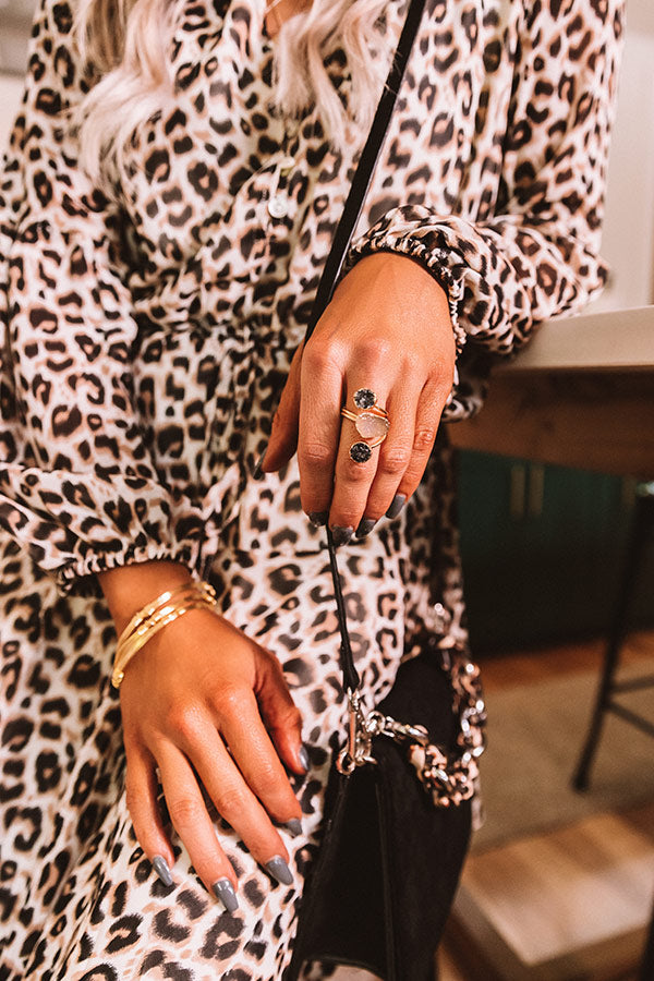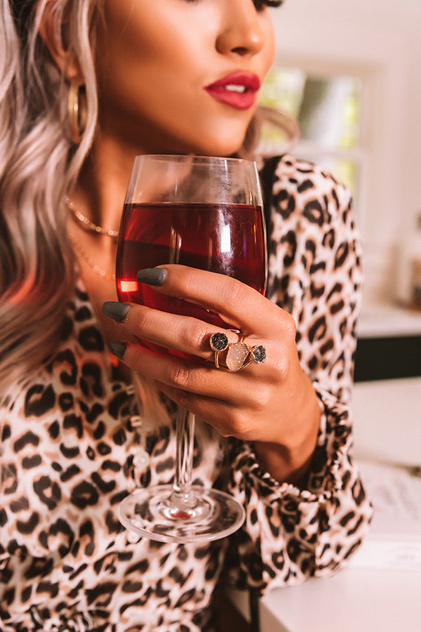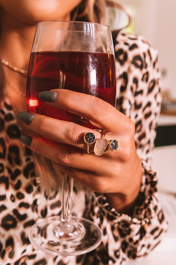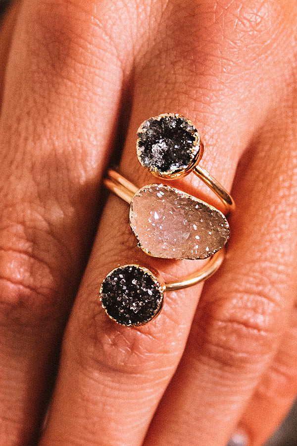 Add a beautifully bold statement to any look by accessorizing with the stunning "Burke" ring featuring a gold wrap band with three black and iridescent druzy stones! Due to the use of natural stones, stones may vary in size, shape or color.