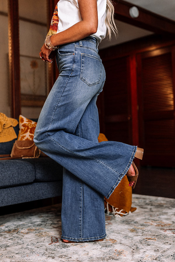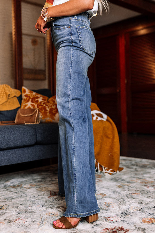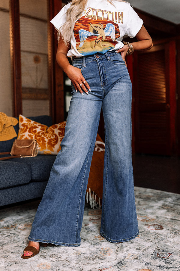 Stay groovy all year round in our cute 'Callowyn' jean featuring lightweight dark wash denim material with accent fading, a high waistline with belt loops, a classic four pocket cut, a hidden zip fly with a button closure, and a relaxed silhouette that falls straight into wide leg ankle-length hemlines!