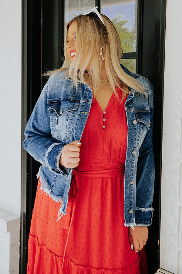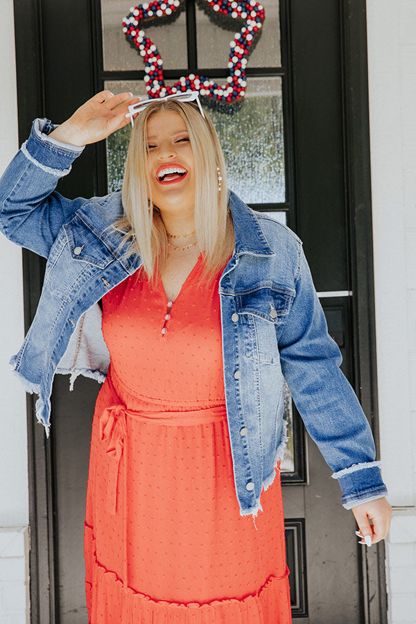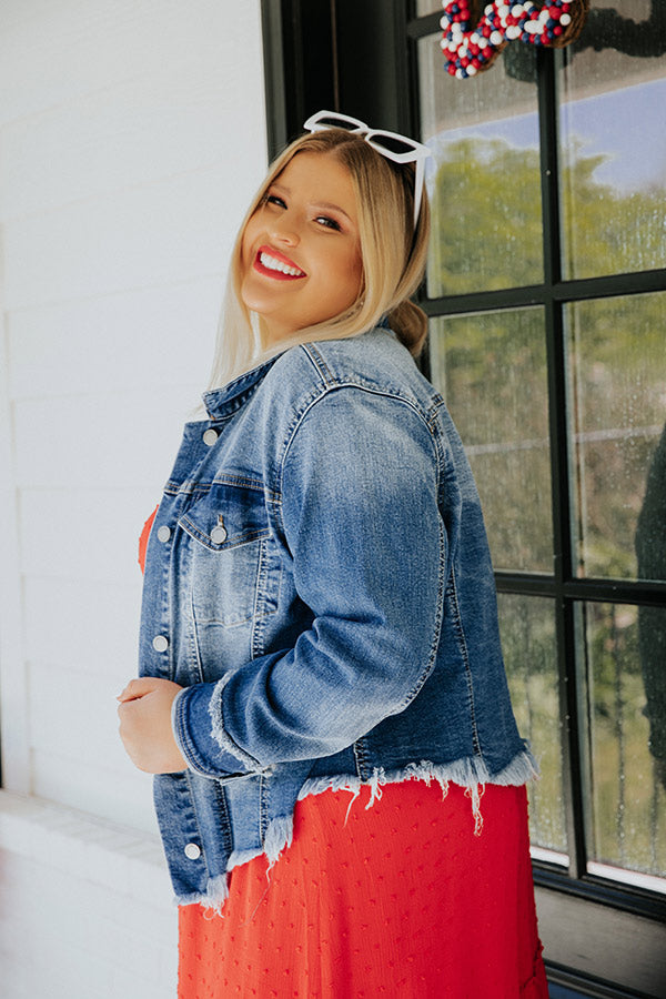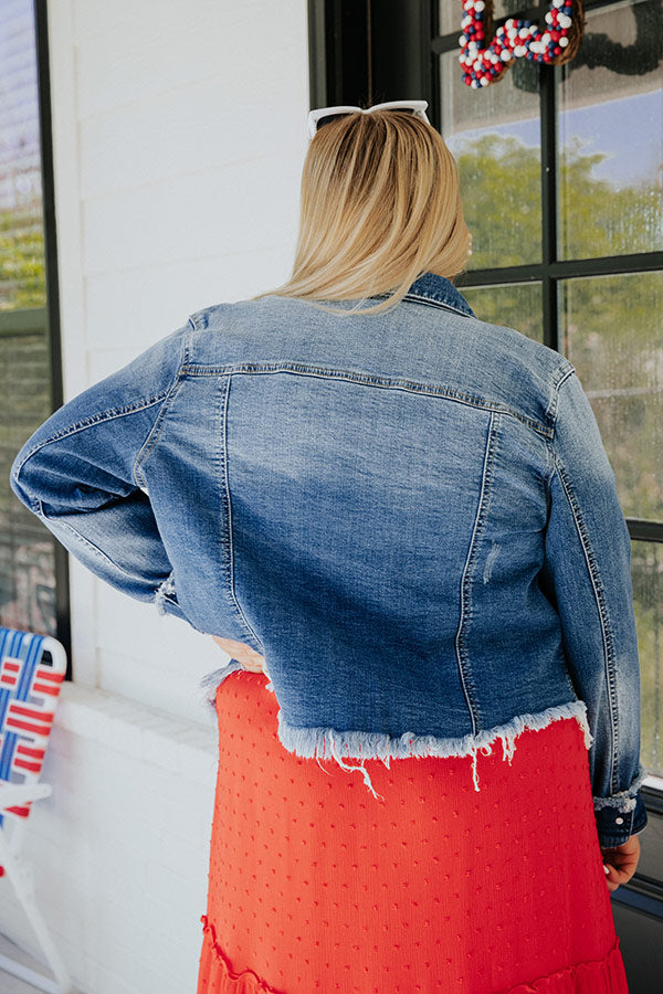 Plus Size - Your seasonal outfits will be envied when you complete your look with 'The Cambria' denim jacket featuring lightweight medium wash material with accent fading, a button down front with a collared neckline, two chest pockets with flap closures, long loose sleeves button closure cuffs that can be rolled, and a relaxed silhouette that falls into a cropped frayed hemline!
