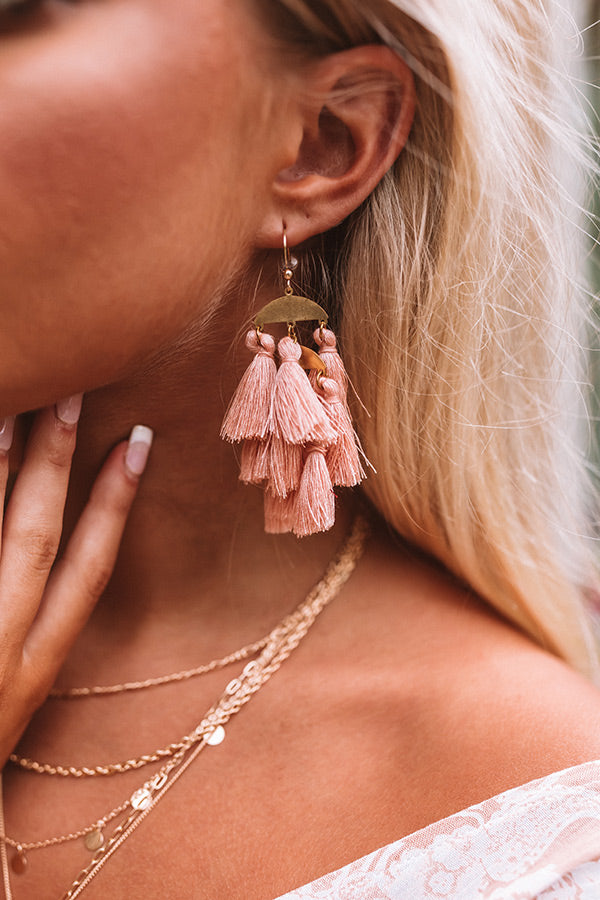 The adorable "Hadley" statement earrings are sure to dance along with you with their two dangling gold half circles and tiered light pink hued tassels!