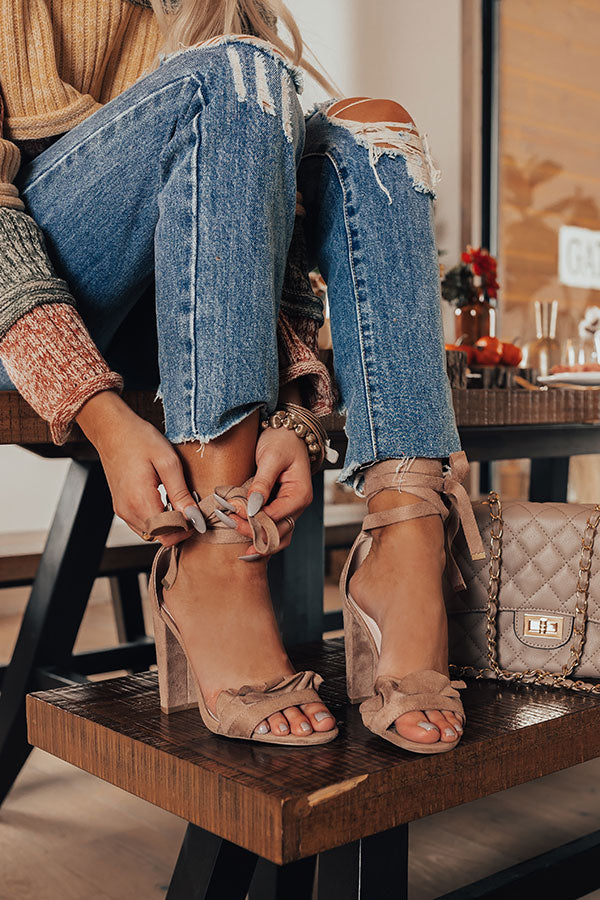 Step into style in our flirty dark taupe hued 'Carleigh' heel featuring faux suede material, a rounded open toe, a ruffled over-the-foot strap, a 4-inch block heel, and a flirty lace-up silhouette! This heel runs more true to size.